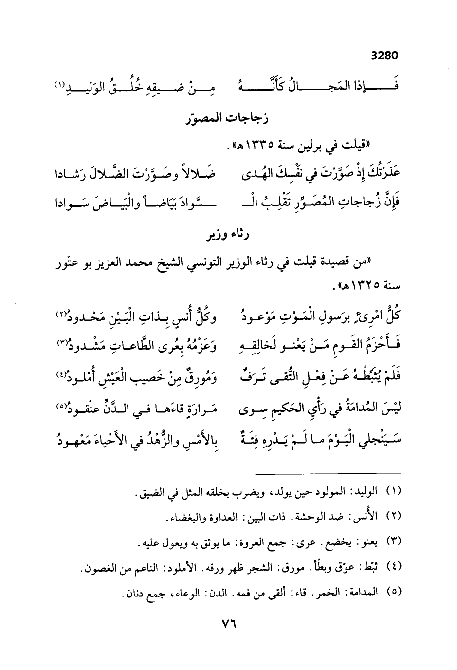 " من قصيدة قيلت في رثاء الوزير التونسي الشيخ محمد العزيز بو عتّور سنة 1325 هـ ".