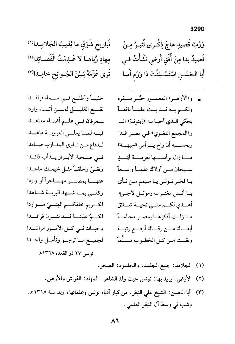 (¬3) أبا الحسن: الشيخ علي النيفر. من كبار أدباء تونس وعلمائها, ولد سنة 1318 هـ.