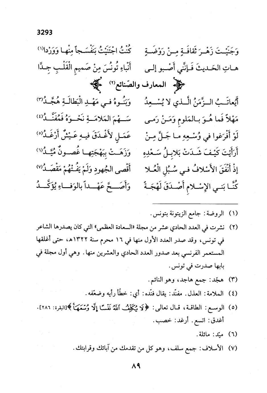 (¬2) نشرت في العدد الحادي عشر من مجلة "السعادة العظمى" التي كان يصدرها الشاعر في تونس، وقد صدر العدد الأول منها في 16 محرم سنة 1322 هـ، حتى أغلقها المستعمر الفرنسي بعد صدور العدد الحادي والعشرين منها. وهي أول مجلة في بابها صدرت في تونس.