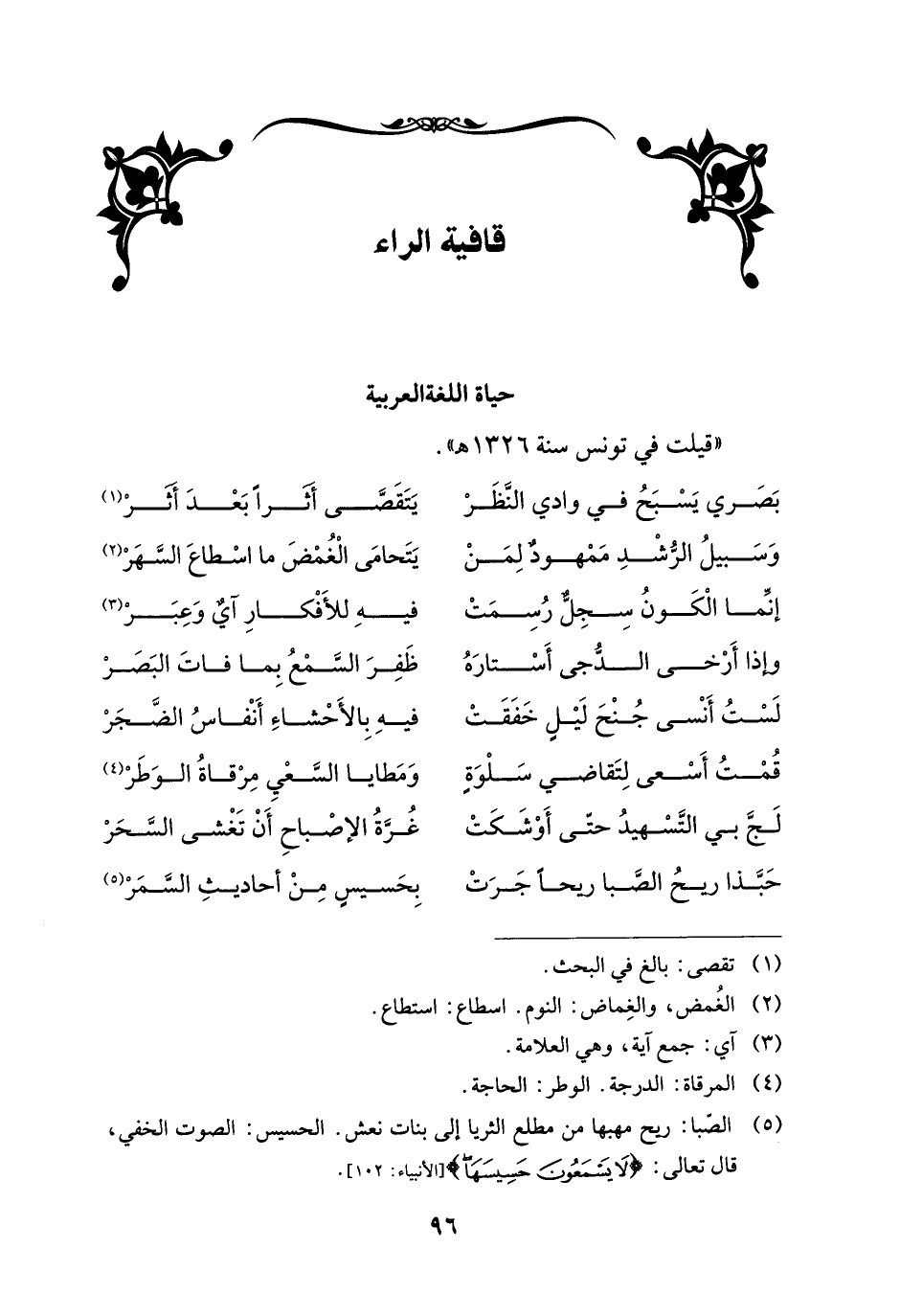 (¬5) الصبا: ريح مهبها من مطلع الثريا إلى بنات نعش. الحسيس: الصوت الخفي، قال تعالى: {لَا يَسْمَعُونَ حَسِيسَهَا} [الأنبياء: 102].