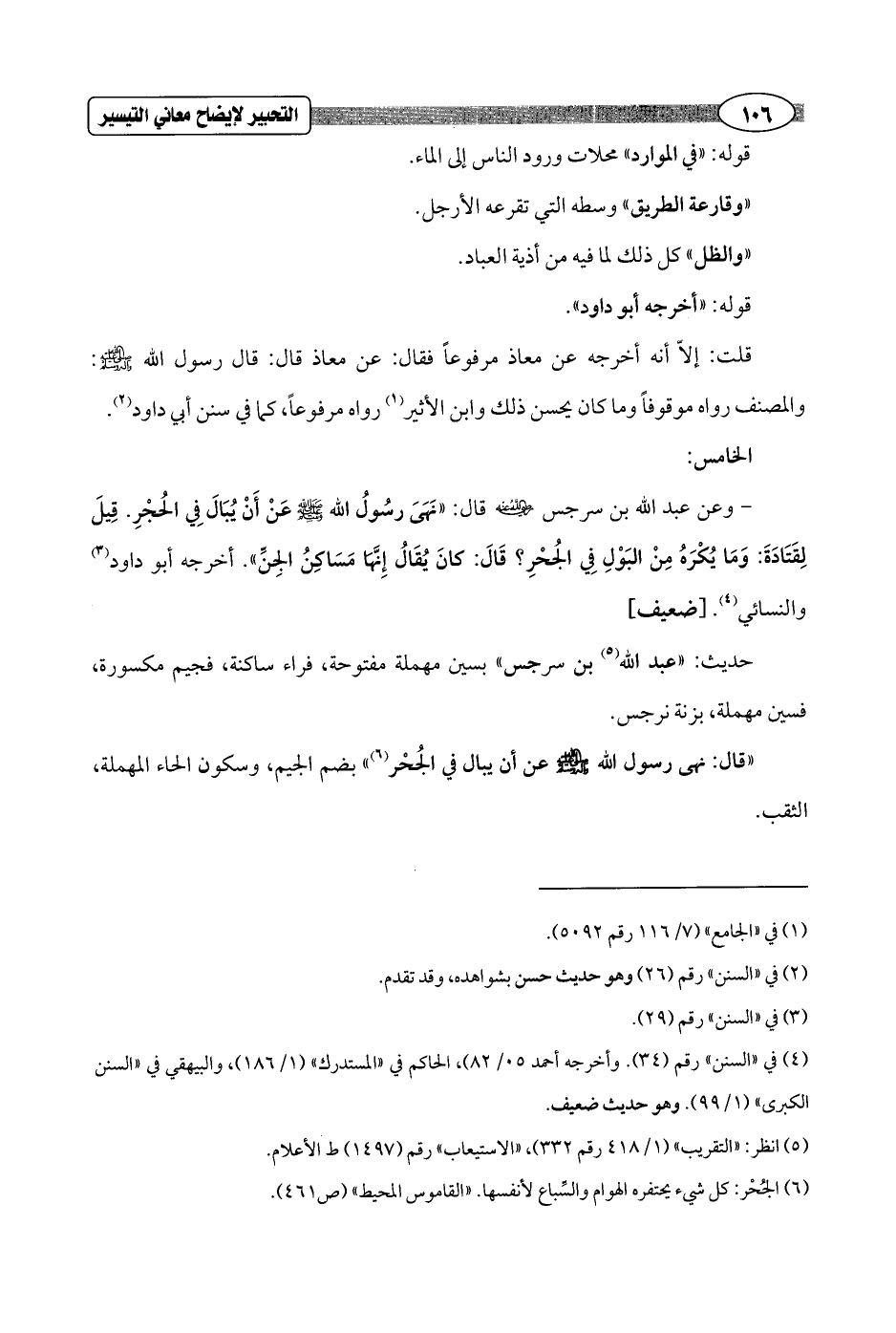 - وعن عبد الله بن سرجس - رضي الله عنه - قال: "نَهَىَ رسُولُ الله - صلى الله عليه وسلم - عَنْ أَن يُبَالَ في الجُحْرِ. قِيلَ لِقَتَادةَ: وَمَا يُكْرَهُ مِنْ البَوْلِ في الجُحْرِ؟ قَالَ: كانَ يُقَالُ إِنَّه مَسَاكِنُ الجِنِّ". أخرجه أبو داود (¬3) والنسائي (¬4). [ضعيف]
