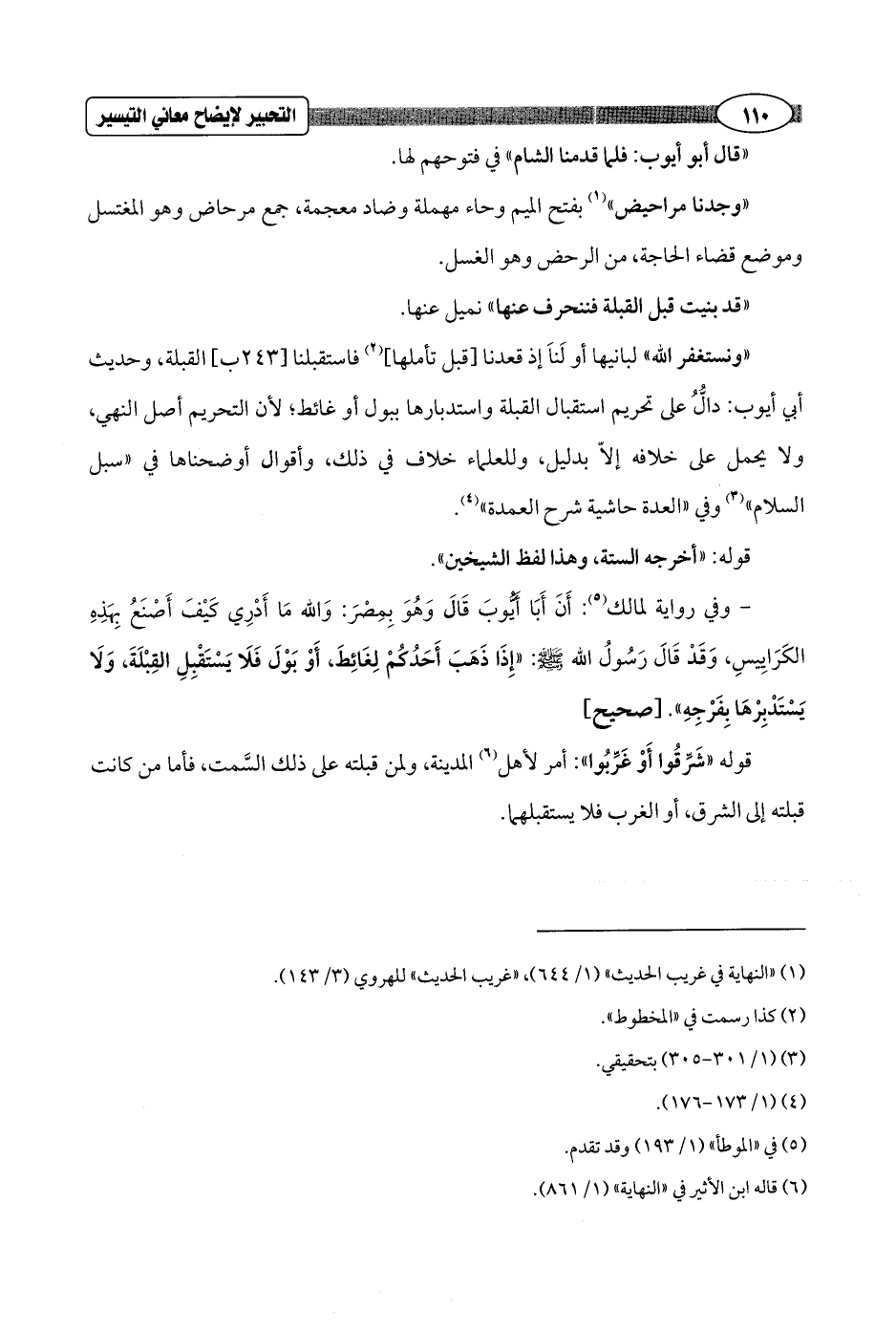 "ونستغفر الله" لبانيها أو لَناَ إذ قعدنا [قبل تأملها] (¬2) فاستقبلنا [243 ب] القبلة، وحديث أبي أيوب: دالٌّ على تحريم استقبال القبلة واستدبارها ببول أو غائط؛ لأن التحريم أصل النهي، ولا يحمل على خلافه إلاّ بدليل، وللعلماء خلاف في ذلك، وأقوال أوضحناها في "سبل السلام" (¬3) وفي "العدة حاشية شرح العمدة" (¬4).