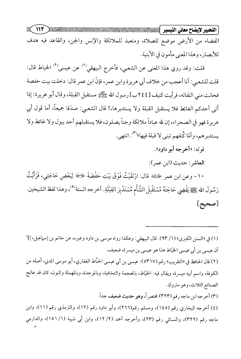 قلت: وقد روي هذا المعنى عن الشعبي، فأخرج البيهقي (¬1) عن عيسى (¬2) الخياط قال: قلت للشعبي: أنا أعجب من خلاف أبي هريرة وابن عمر، فإنّ ابن عمر قال: دخلت بيت حفصة فحانت مني التفاته، فرأيت كنيف [244 ب] رسول الله - صلى الله عليه وسلم - مستقبل القبلة، وقال أبو هريرة: إذا أتى أحدكم الغائط فلا يستقبل القبلة ولا يستدبرها،! قال الشعبي: صدَقا جميعاً، أما قول أبي هريرة فهو في الصحراء، إن لله عباداً ملائكة وجناً يصلون، فلا يستقبلهم أحد ببول ولا غائط ولا يستدبرهم، وأمّا كُنفهم تبنى لا قبلة فيها" (¬3). انتهى.