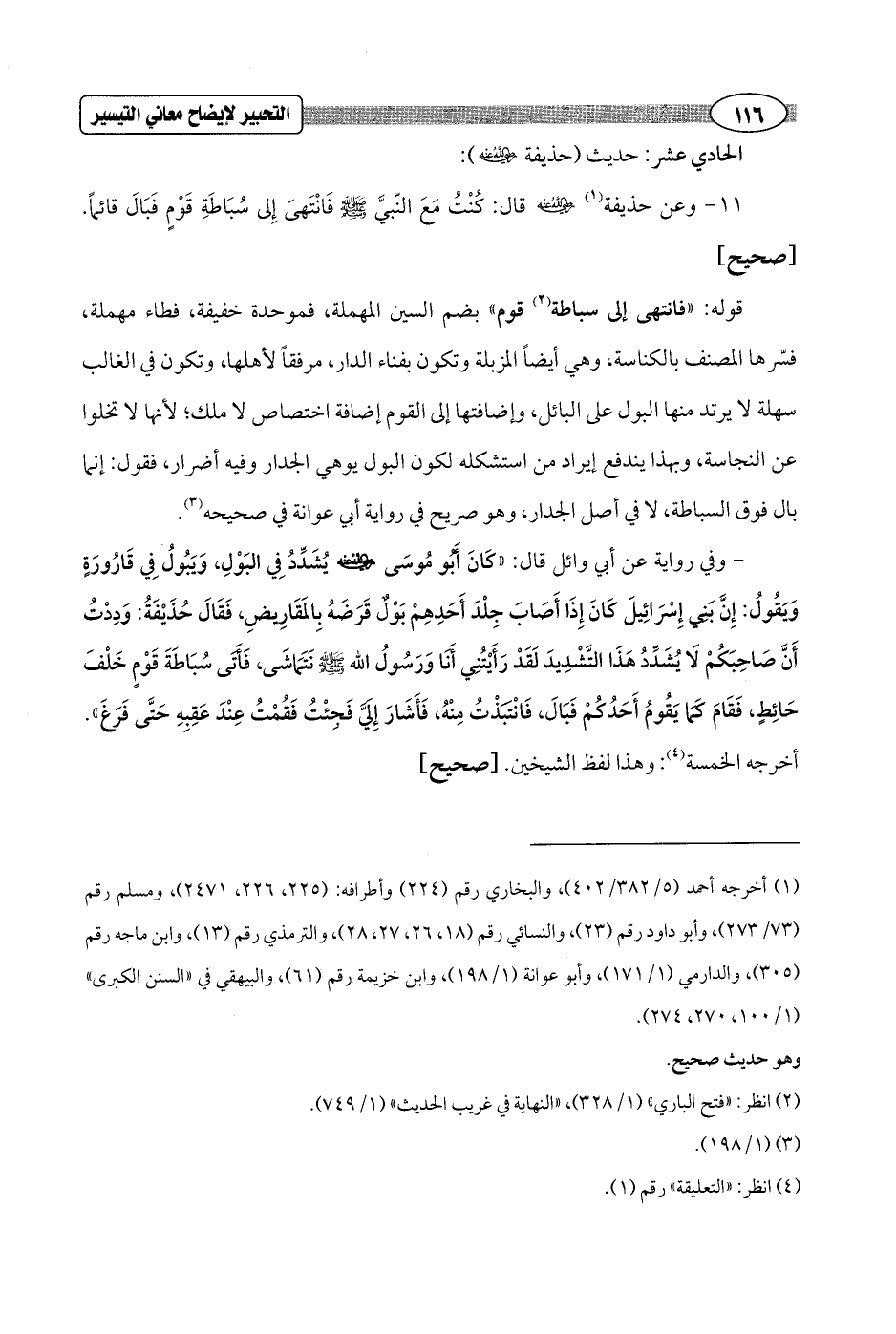 11 - وعن حذيفة (¬1) - رضي الله عنه - قال: كُنْتُ مَعَ النّبيَّ - صلى الله عليه وسلم - فَانْتَهىَ إِلى سُبَاطَةِ قَوْمٍ فَبَالَ قائماً. [صحيح]