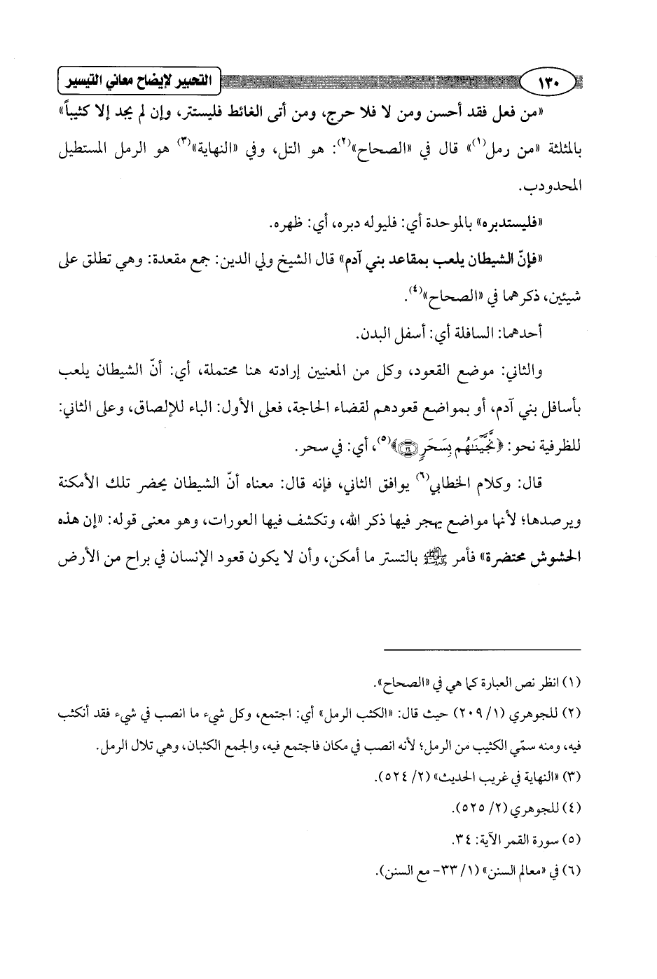 والثاني: موضع القعود، وكل من المعنيين إرادته هنا محتملة، أي: أنّ الشيطان يلعب بأسافل بني آدم، أو بمواضع قعودهم لقضاء الحاجة, فعلى الأول: الباء للإلصاق، وعلى الثاني: للظرفية نحو: {نَجَّيْنَاهُمْ بِسَحَرٍ (34)} (¬5)، أي: في سحر.