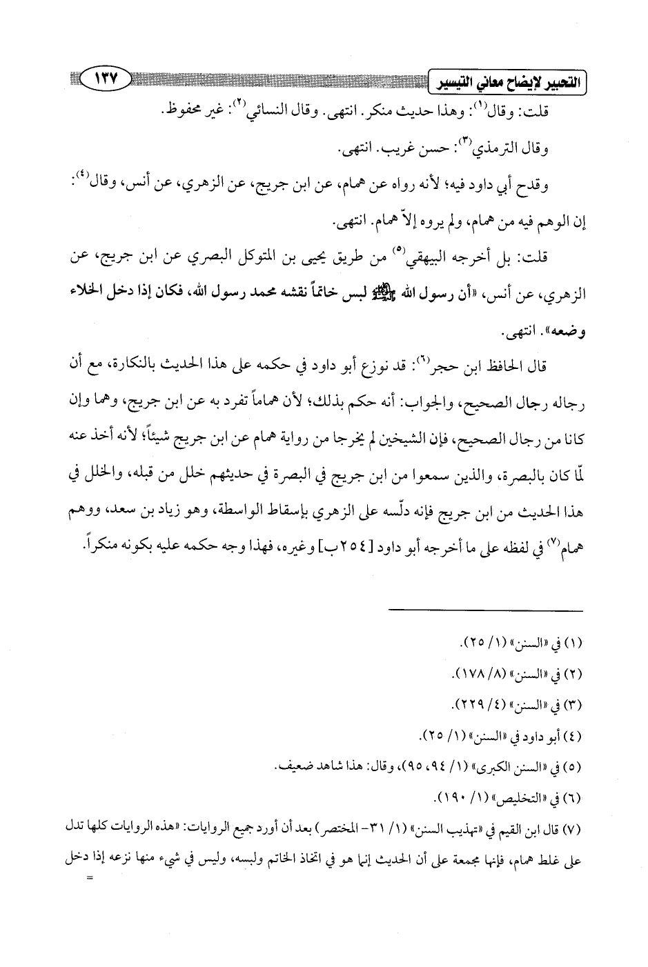 قال الحافظ ابن حجر (¬6): قد نوزع أبو داود في حكمه على هذا الحديث بالنكارة، مع أن رجاله رجال الصحيح، والجواب: أنه حكم بذلك؛ لأن هماماً تفرد به عن ابن جريج، وهما وإن كانا من رجال الصحيح، فإن الشيخين لم يخرجا من رواية همام عن ابن جريج شيئاً؛ لأنه أخذ عنه لمّا كان بالبصرة، والذين سمعوا من ابن جريج في البصرة في حديثهم خلل من قبله، والخلل في هذا الحديث من ابن جريج فإنه دلّسه على الزهري بإسقاط الواسطة, وهو زياد بن سعد، ووهم همام (¬7) في لفظه على ما أخرجه أبو داود [254 ب] وغيره، فهذا وجه حكمه عليه بكونه منكراً.