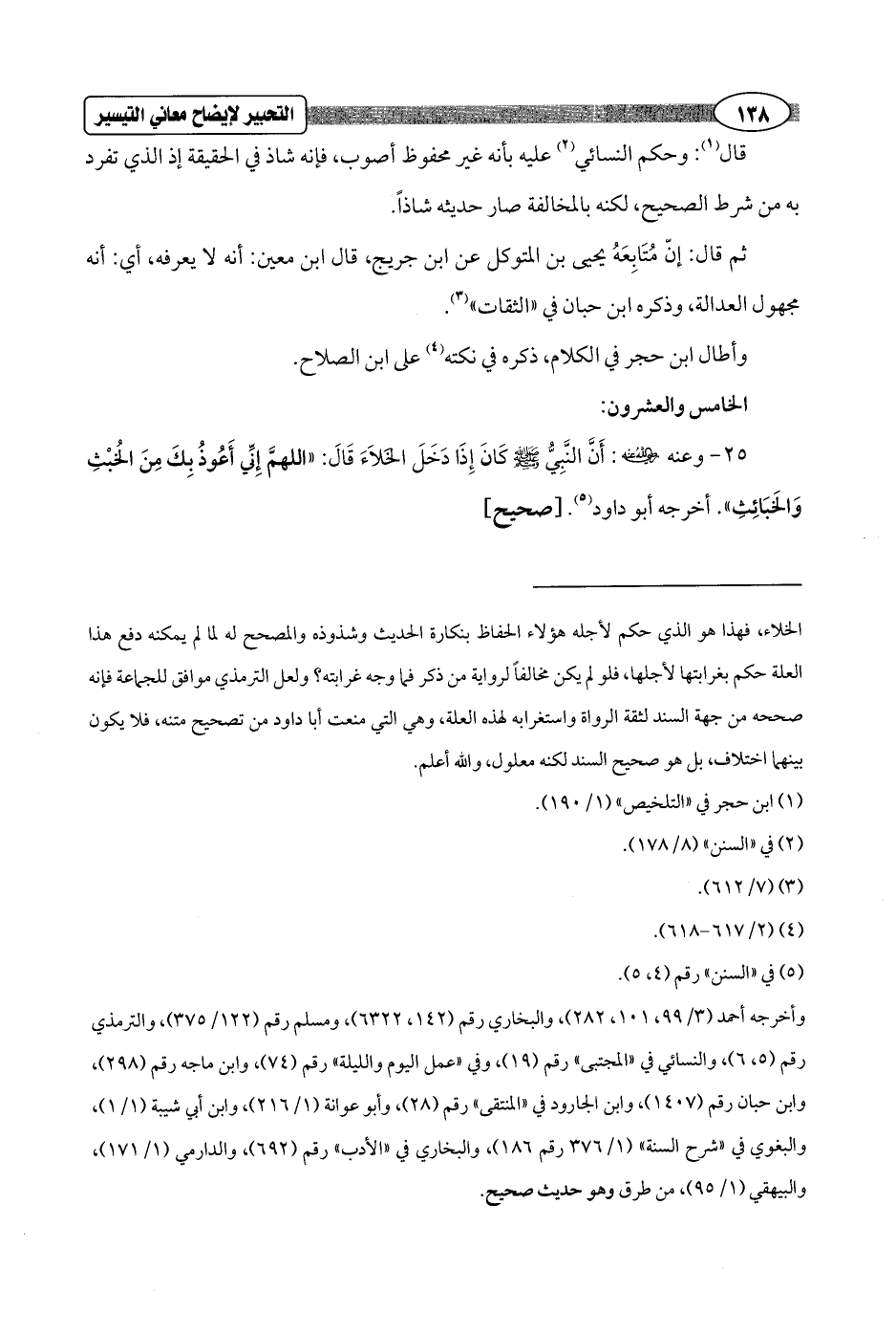 = الخلاء، فهذا هو الذي حكم لأجله هؤلاء الحفاظ بنكارة الحديث وشذوذه والمصحح له لما لم يمكنه دفع هذه العلة حكم بغرابتها لأجلها، فلو لم يكن مخالفاً لرواية من ذكر فما وجه غرابته؟ ولعل الترمذي موافق للجماعة فإنه صححه من جهة السند لثقة الرواة واستغرابه لهذه العلة، وهي التي منعت أبا داود من تصحيح متنه، فلا يكون بينهما اختلاف، بل هو صحيح السند لكنه معلول، والله أعلم.