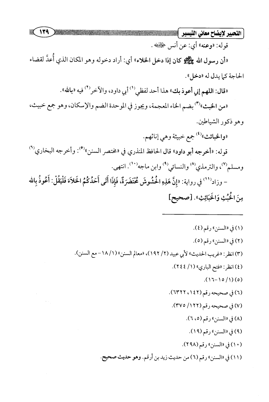 - وزاد (¬11) في رواية: "إِنَّ هَذِهِ الحُشُوشَ مُحْتَضَرَةٌ، فَإِذَا أَتَى أَحَدُكُمُ الخَلاَءَ فَلْيَقُلْ: أَعُوذُ بِالله مِنَ الخُبُثِ وَالخَبَائِثِ". [صحيح]