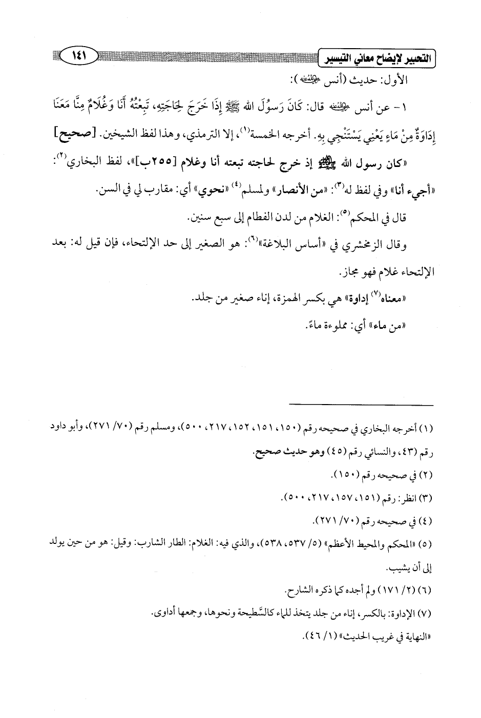 1 - عن أنس - رضي الله عنه - قال: كَانَ رَسوُلَ الله - صلى الله عليه وسلم - إِذَا خَرَجَ لِحَاجَتِهِ, تَبِعْتُهُ أَنَا وَغُلَامٌ مِنَّا مَعَنَا إِدَاوَةٌ مِنْ مَاءٍ يَعْنِي يَسْتَنْجِي بِهِ. أخرجه الخمسة (¬1)، إلا الترمذي، وهذا لفظ الشيخين. [صحيح]