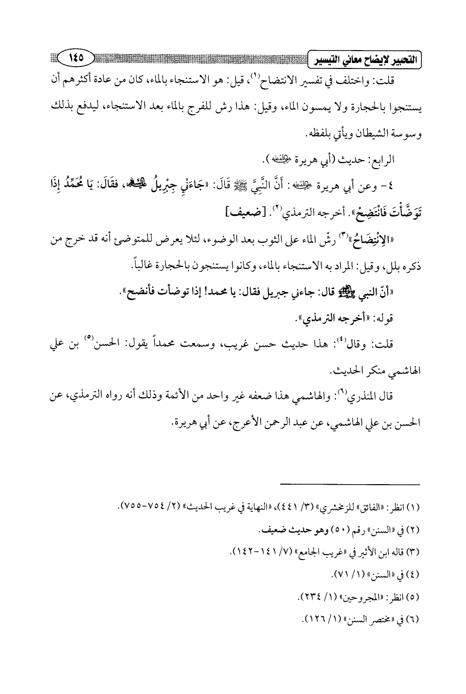 4 - وعن أبي هريرة - رضي الله عنه -: أَنَّ النَّبِيَّ - صلى الله عليه وسلم - قَالَ: "جَاءَنْيِ جِبْرِيلُ - عليه السلام -، فقَالَ: يَا مُحَمِّدُ إذَا تَوَضَّأْتَ فَانْتَضِحْ". أخرجه الترمذي (¬2). [ضعيف]