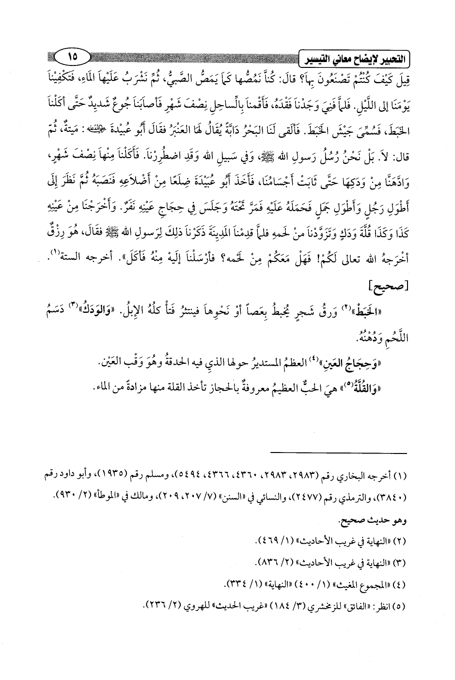 قِيلَ كَيْفَ كُنْتُمْ تَصْنَعُونَ بِهاَ؟ قَالَ: كُناَّ نَمُصُّها كَماَ يَمَصُّ الصَّبيُّ، ثُمَّ نَشْرَبُ عَلَيْهاَ المَاءِ، فَتَكفِيْناَ يَوْمَنَا إلى اللَّيْلِ. فَلماَّ فَنِيَ وَجَدْناَ فَقْدَهُ، فَأَقْمناَ بِالِّساحِلِ نِصْفَ شَهْرِ فَأصاَبَناَ جُوعٌ شَديِدٌ حَتَّى أكَلْناَ الخَبَطَ فَسُمِّىَ جَيْشَ الَخَبَطَ. فَألَقى لَنَا البَحْرُ دَابَّةً يُقَالُ لَهَا العَنْبَرُ فقَالَ أَبُو عُبيْدةَ - رضي الله عنه -: مَيتةٌ، ثُمّ قال: لاَ. بَلْ نَحْنُ رُسُلُ رَسولِ الله - صلى الله عليه وسلم -، وَفي سَبيلِ الله وَقَدِ اضطُرِرْناَ. فَأَكَلْناَ مِنْهاَ نِصْفَ شَهْرٍ، وَادَّهَنَّا مِنْ وَدَكِهَا حَتَّى ثَابَتْ أَجْسَامُنَا، فَأَخَذَ أَبُو عُبَيْدَةَ ضِلَعًا مِنْ أَضْلاَعِهِ فَنَصَبَهُ ثُمَّ نَظَرَ إِلَى أَطْوَلِ رَجُلٍ وَأَطْوَلِ جَمَلٍ فَحَمَلَهُ عَلَيْهِ فَمَرَّ تَحْتَهُ وَجَلَسَ فِي حِجَاجِ عَيْنِهِ نَفَرٌ. وَأَخْرَجْنَا مِنْ عَيْنِهِ كَذَا وَكَذَا قُلَّةَ وَدَكٍ وَتَزَوَّدْناَ منْ لحَمهِ فلمَّا قدِمْناَ المَدِيِنَةَ ذَكَرْناَ ذلِكَ لِرَسولِ الله - صلى الله عليه وسلم - فقَالَ، هُوَ رِزْقٌ أخْرَجهُ الله تعالى لَكُمْ! فَهَلْ مَعَكُمْ مِنْ لَحْمه؟ فأرْسَلْناَ إلَيهْ مِنْهُ فَأكَلَ". أخرجه الستة (¬1). [صحيح]