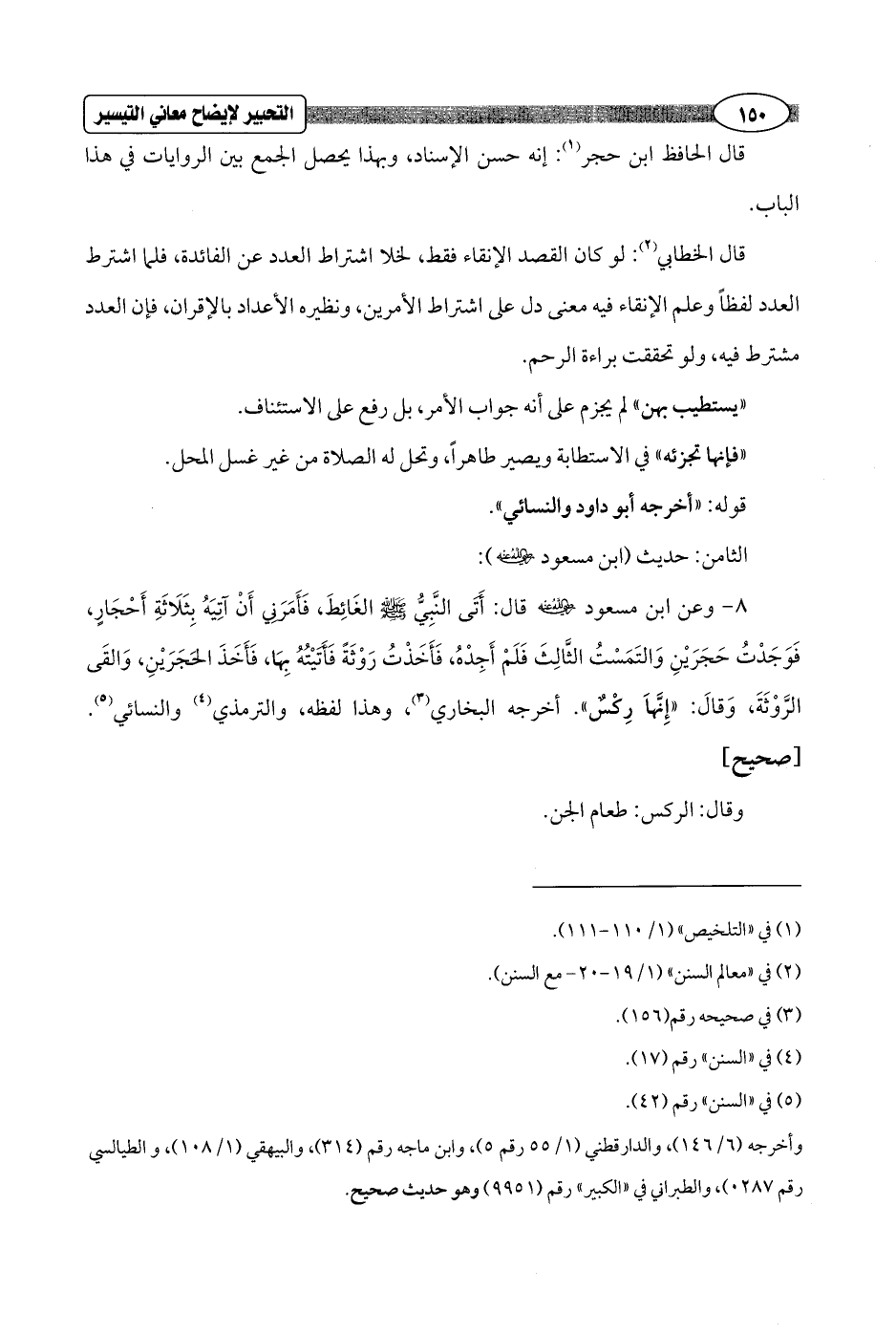 8 - وعن ابن مسعود - رضي الله عنه - قال: أَتَى النَّبِيُّ - صلى الله عليه وسلم - الغَائِطَ، فَأَمَرَنِي أَنْ آتِيَهُ بِثَلَاثَةِ أَحْجَارٍ، فَوَجَدْتُ حَجَرَيْنِ وَالتَمَسْتُ الثَّالِثَ فَلَمْ أَجِدْهُ، فَأَخَذْتُ رَوْثَةً فَأَتَيْتُهُ بِهَا، فَأَخَذَ الحَجَرَيْنِ، وَالقَى الرَّوْثَةَ, وَقالَ: "إِنَّهاَ رِكْسٌ". أخرجه البخاري (¬3)، وهذا لفظه، والترمذي (¬4) والنسائي (¬5). [صحيح]
