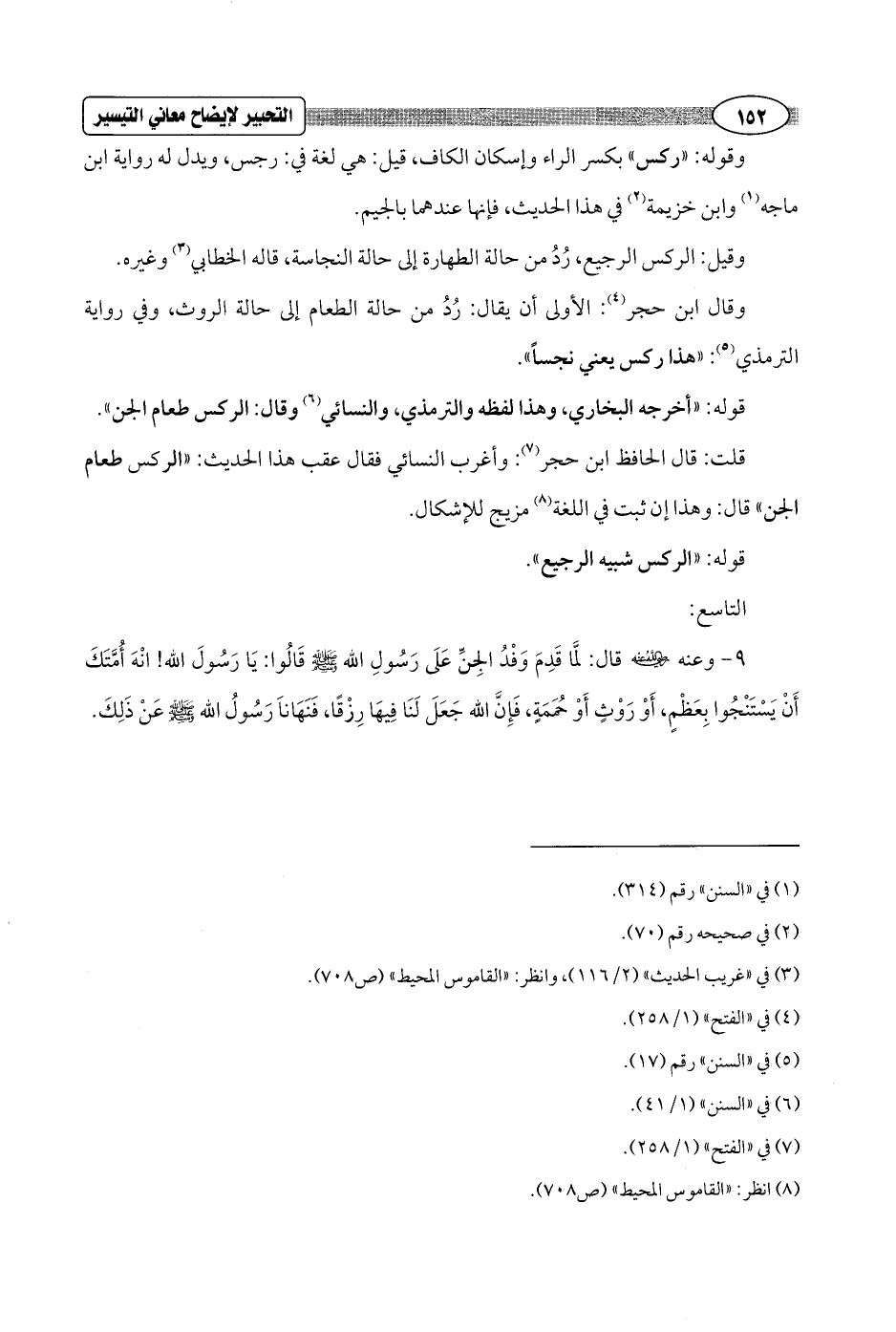 9 - وعنه - رضي الله عنه - قال: لمَّا قَدِمَ وَفْدُ الجِنِّ عَلَى رَسُولِ الله - صلى الله عليه وسلم - قَالُوا: يَا رَسُولَ الله! انْهَ أُمَّتَكَ أَنْ يَسْتَنْجُوا بِعَظْمٍ، أَوْ رَوْثٍ أَوْ حُمَمَةٍ, فَإِنَّ الله جَعَلَ لَنَا فِيهَا رِزْقًا، فَنَهَاناَ رَسُولُ الله - صلى الله عليه وسلم - عَنْ ذَلِكَ.
