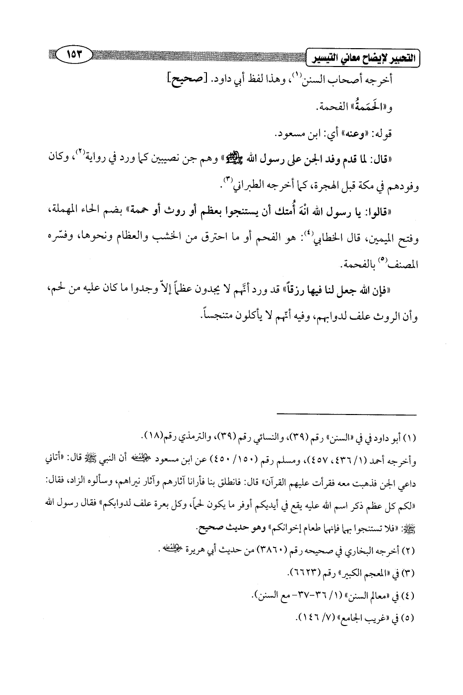 وأخرجه أحمد (1/ 436، 457)، ومسلم رقم (150/ 450) عن ابن مسعود - رضي الله عنه - أن النبي - صلى الله عليه وسلم - قال: "أتاني داعي الجن فذهبت معه فقرأت عليهم القرآن" قال: فانطلق بنا فأرانا آثارهم وآثار نيراهم، وسألوه الزاد، فقال: "لكم كل عظم ذكر اسم الله عليه يقع في أيديكم أوفر ما يكون لحماً، وكل بعرة علف لدوابكم" فقال رسول الله - صلى الله عليه وسلم -: "فلا تستنجوا بهما فإنهما طعام إخوانكم" وهو حديث صحيح.
