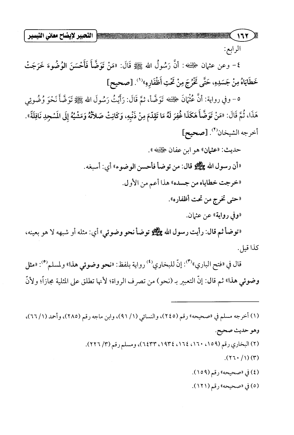 5 - وفي رواية: أنَّ عُثْمَانَ - رضي الله عنه - تَوَضَّأ، ثمَّ قَالَ: رَأَيْتُ رَسُولَ الله - صلى الله عليه وسلم - تَوَضَّأَ نَحْوَ وُضُوئِي هَذَا، ثُمَّ قَالَ: "مَنْ تَوَضَّأَ هَكَذَا غُفِرَ لَهُ مَا تَقدّمَ مِنْ ذَنْبِهِ, وَكَانِتْ صَلاَتُهُ وَمَشْيُهُ إِلَى المَسْجِدِ نَافِلَةً". أخرجه الشيخان (¬2). [صحيح]