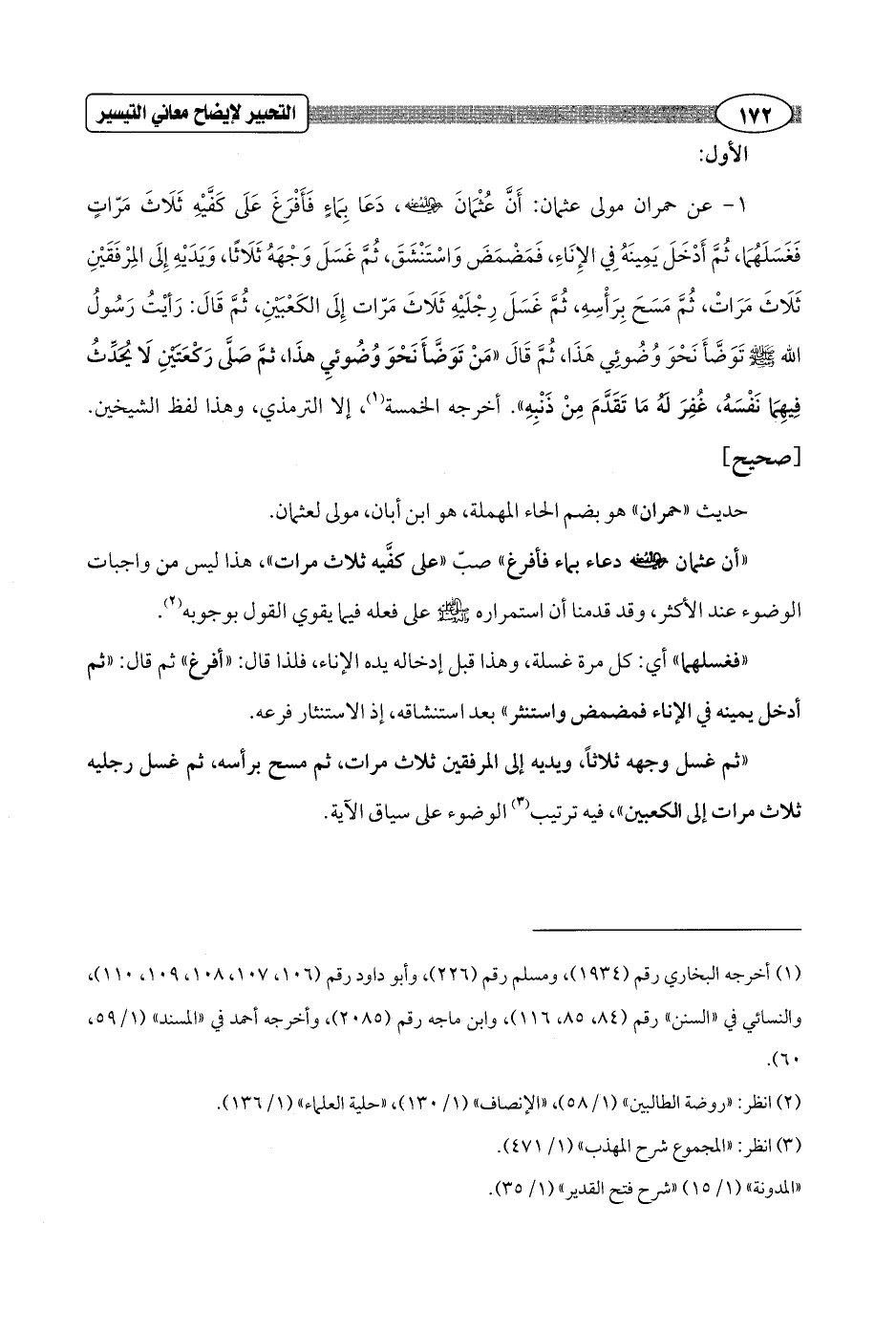 1 - عن حمران مولى عثمان: أَنَّ عُثْمَانَ - رضي الله عنه -، دَعَا بِمَاءٍ فَأَفْرَغَ عَلَى كَفَّيْهِ ثَلَاثَ مَرّاتٍ فَغَسَلَهُمَا، ثُمَّ أَدْخَلَ يَمِينَهُ فِي الإِنَاءِ، فَمَضْمَضَ وَاسْتَنْشَقَ، ثُمَّ غَسَلَ وَجْهَهُ ثَلَاثًا، وَيَدَيْهِ إِلَى المِرْفَقيْنِ ثَلَاثَ مَرَاتْ، ثُمَّ مَسَحَ بِرَأْسِهِ, ثُمَّ غَسَلَ رِجْلَيْهِ ثَلَاثَ مَرّات إِلَى الكَعْبَيْنِ، ثُمَّ قَالَ: رَأيْتُ رَسُولُ الله - صلى الله عليه وسلم - تَوَضَّأَ نَحْوَ وُضُوئِي هَذَا، ثُمَّ قَالَ "مَنْ تَوَضَّأَ نَحْوَ وُضُوئيِ هذَا، ثمَّ صَلَّى رَكعَتيْنِ لَا يُحَدِّثُ فِيهَمَا نَفْسَهُ, غُفِرَ لَهُ مَا تَقَدَّمَ مِنْ ذَنْبِهِ". أخرجه الخمسة (¬1)، إلا الترمذي، وهذا لفظ الشيخين. [صحيح]