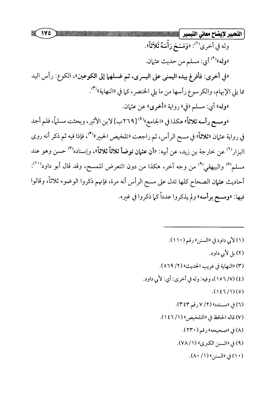 "ومسح رأسه ثلاثاً" هكذا في "الجامع" (¬4) [269 ب] لابن الأثير، وبحثت مسلماً، فلم أجد في رواية عثمان "ثلاثاً" في مسح الرأس، ثم راجعت "تلخيص الحبير" (¬5)، فإذا فيه ثم ذكر أنه روى البزار (¬6) عن خارجة بن زيد، عن أبيه: "أن عثمان توضأ ثلاثاً ثلاثاً"، وإسناده (¬7) حسن وهو عند مسلم (¬8) والبيهقي (¬9) من وجه آخر، هكذا من دون التعرض للمسح، وقد قال أبو داود (¬10): أحاديث عثمان الصحاح كلها تدل على مسح الرأس أنه مرة، فإنهم ذكروا الوضوء ثلاثاً، وقالوا فيها: "ومسح برأسه" ولم يذكروا عدداً كما ذكروا في غيره.