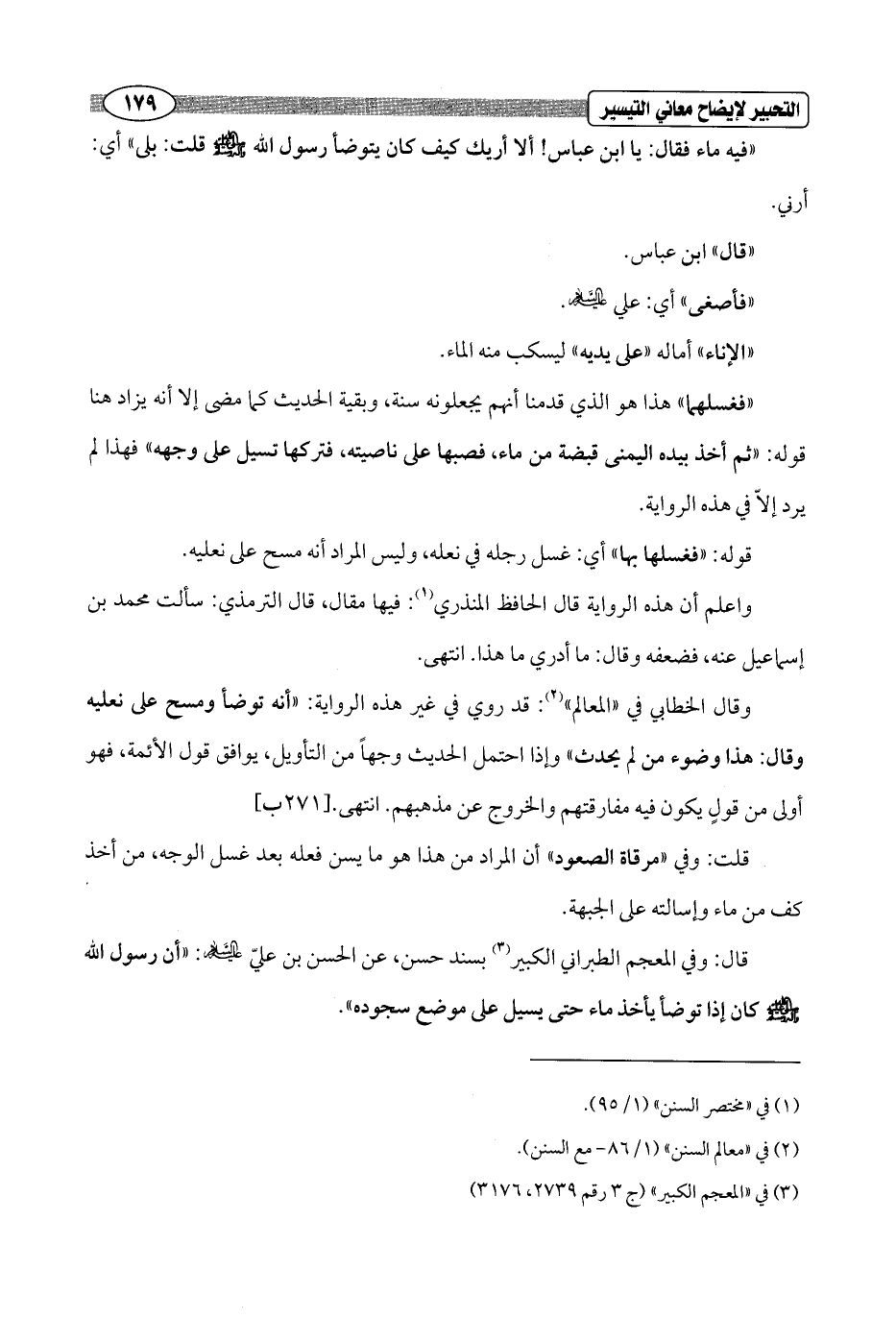 قال: وفي المعجم الطبراني الكبير (¬3) بسند حسن، عن الحسن بن عليّ - عليه السلام -: "أن رسول الله - صلى الله عليه وسلم - كان إذا توضأ يأخذ ماء حتى يسيل على موضع سجوده".