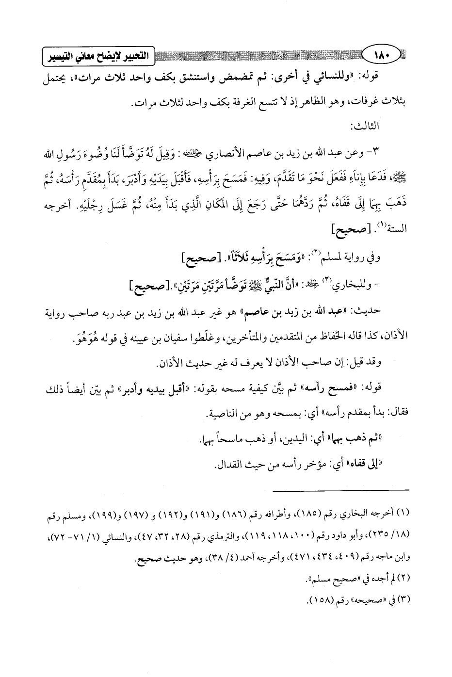 (¬1) أخرجه البخاري رقم (185)، وأطرافه رقم (186) و (191) و (192) و (197) و (199)، ومسلم رقم (18/ 235)، وأبو داود رقم (100، 118، 119)، والترمذي رقم (28، 32، 47)، والنسائي (1/ 71 - 72)، وابن ماجه رقم (409، 434، 471)، وأخرجه أحمد (4/ 38)، وهو حديث صحيح.