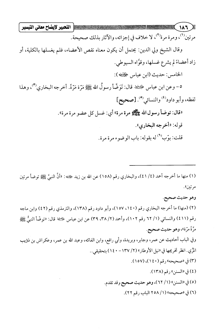 5 - وعن ابن عباس - رضي الله عنهما - قال: تَوَضَّأ رسولُ الله - صلى الله عليه وسلم - مَرّة مَرّةً. أخرجه البخاري (¬3)، وهذا لفظه، وأبو داود (¬4) والنسائي (¬5). [صحيح]