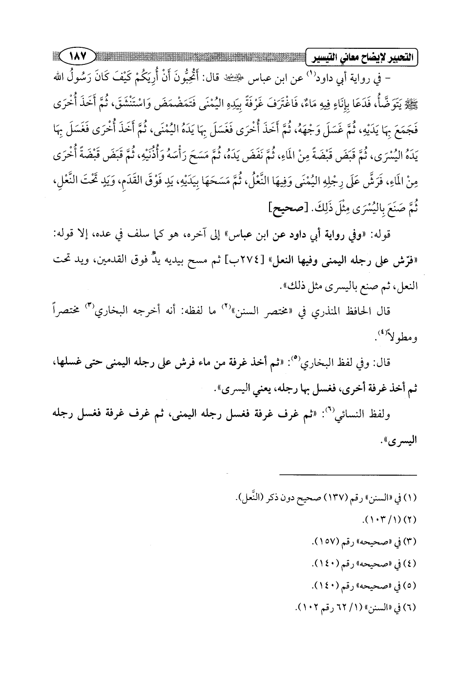 قوله: "وفي رواية أبي داود عن ابن عباس" إلى آخره، هو كما سلف في عده، إلا قوله: "فرّش على رجله اليمنى وفيها النعل" [274 ب] ثم مسح بيديه يدٌ فوق القدمين، ويد تحت النعل، ثم صنع باليسرى مثل ذلك".