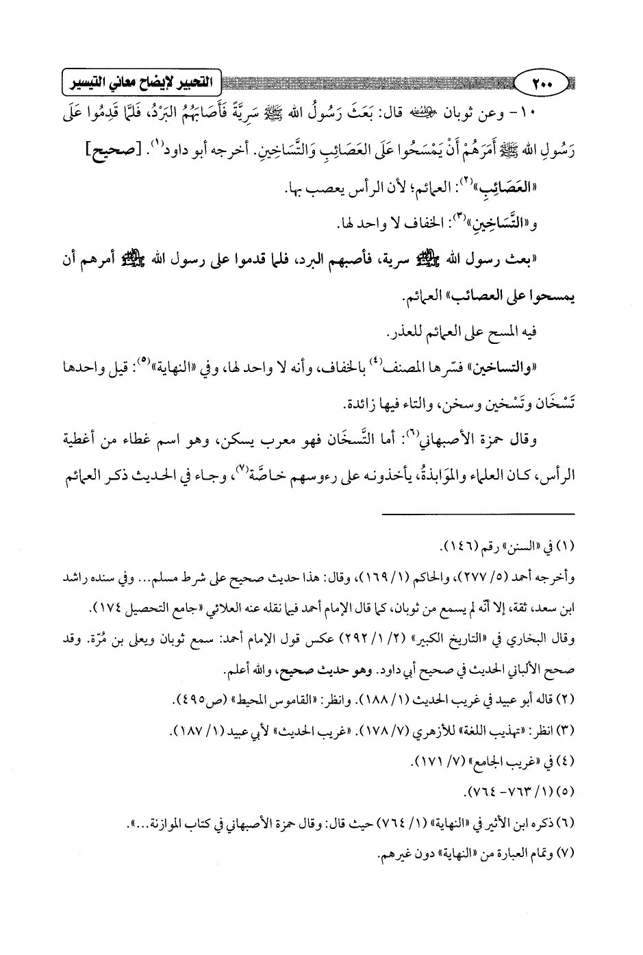 10 - وعن ثوبان - رضي الله عنه - قال: بَعَثَ رَسُولُ الله - صلى الله عليه وسلم - سَرِيَّةً فَأَصَابَهُمُ البَرْدُ، فَلمَّا قَدِمُوا عَلَى رَسُولِ الله - صلى الله عليه وسلم - أمَرَهُمْ أَنْ يَمْسَحُوا عَلَى العَصَائِبِ وَالتَّسَاخِينِ. أخرجه أبو داود (¬1). [صحيح]