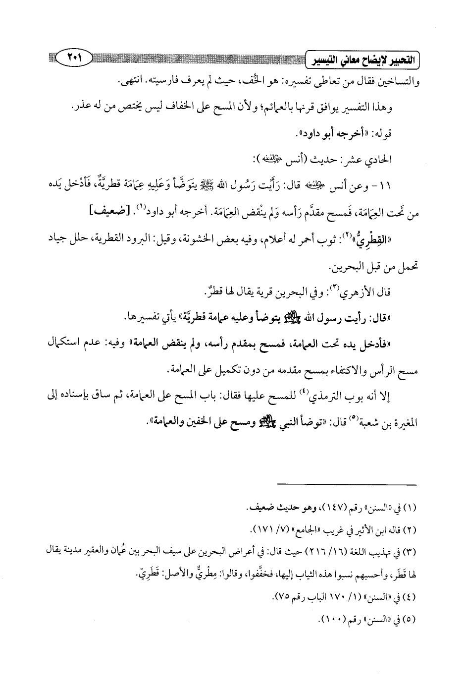 11 - وعن أنس - رضي الله عنه - قال: رَأَيْت رَسُول الله - صلى الله عليه وسلم - يتَوَضَّأ وَعَلِيهِ عِمَامَة قطريَّةٌ، فَأدْخل يَده من تَحت العِمَامَة، فَمسح مقدَّم رَأسه وَلم ينْقض العِمَامَة. أخرجه أبو داود (¬1). [ضعيف]