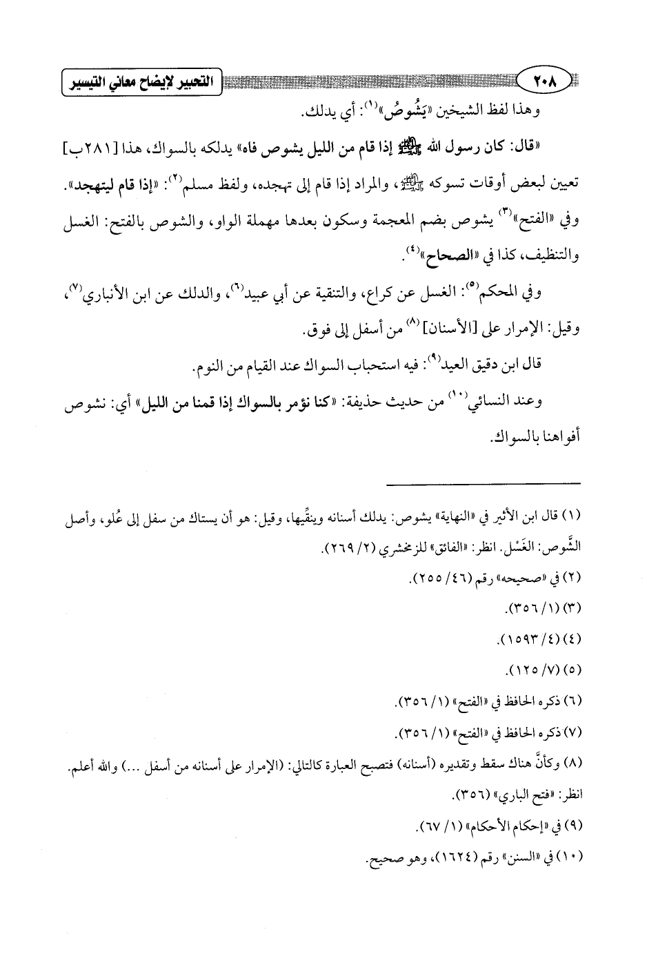 "قال: كان رسول الله - صلى الله عليه وسلم - إذا قام من الليل يشوص فاه" يدلكه بالسواك، هذا [281 ب] تعيين لبعض أوقات تسوكه - صلى الله عليه وسلم -، والمراد إذا قام إلى تهجده، ولفظ مسلم (¬2): "إذا قام ليتهجد". وفي "الفتح" (¬3) يشوص بضم المعجمة وسكون بعدها مهملة الواو، والشوص بالفتح: الغسل والتنظيف، كذا في "الصحاح" (¬4).