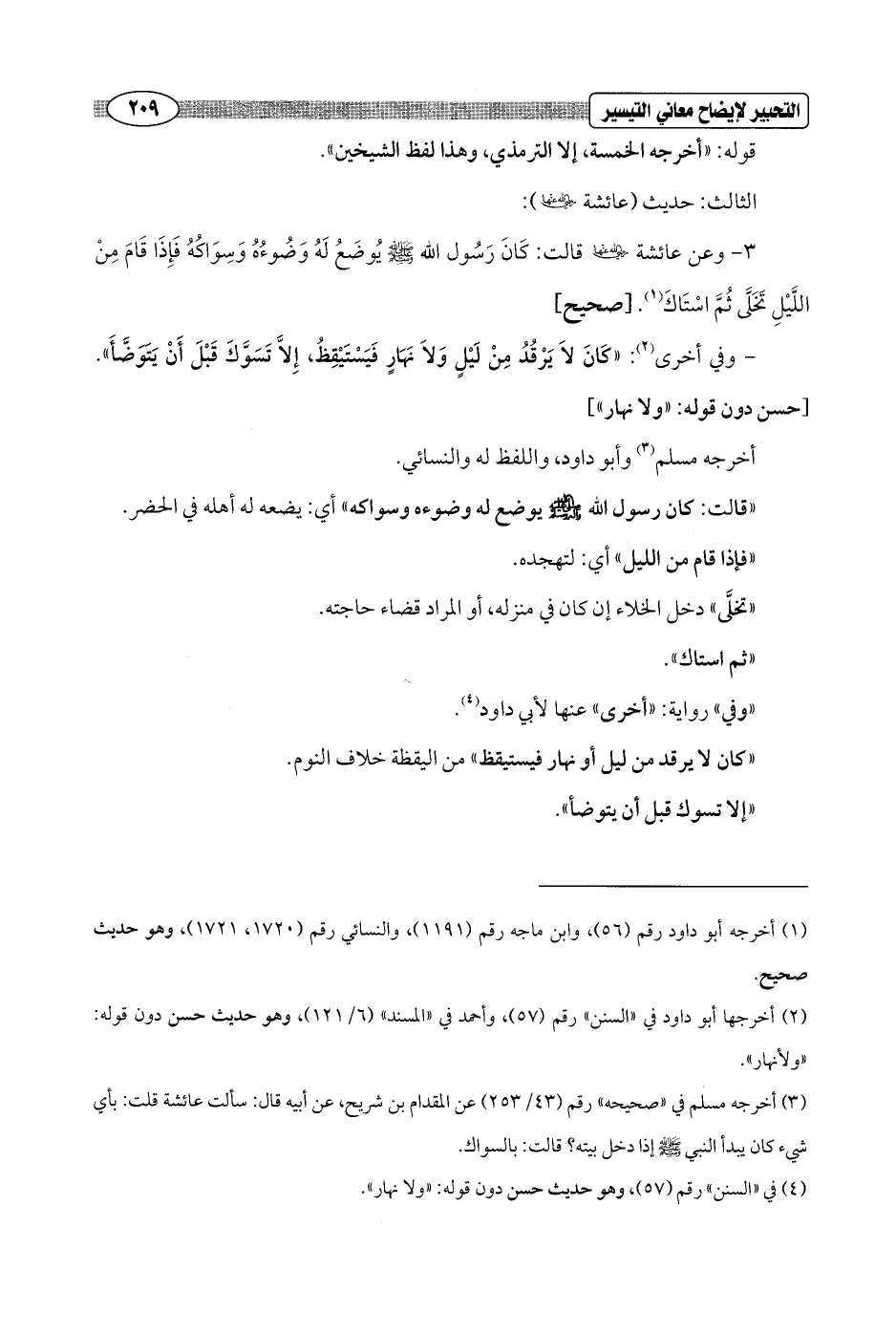 - وفي أخرى (¬2): "كَانَ لاَ يَرْقُدُ مِنْ لَيْلٍ وَلاَ نَهَارٍ فَيَسْتَيْقِظُ، إِلاَّ تَسَوَّكَ قَبْلَ أَنْ يَتَوَضَّأَ". [حسن دون قوله: "ولا نهار"]