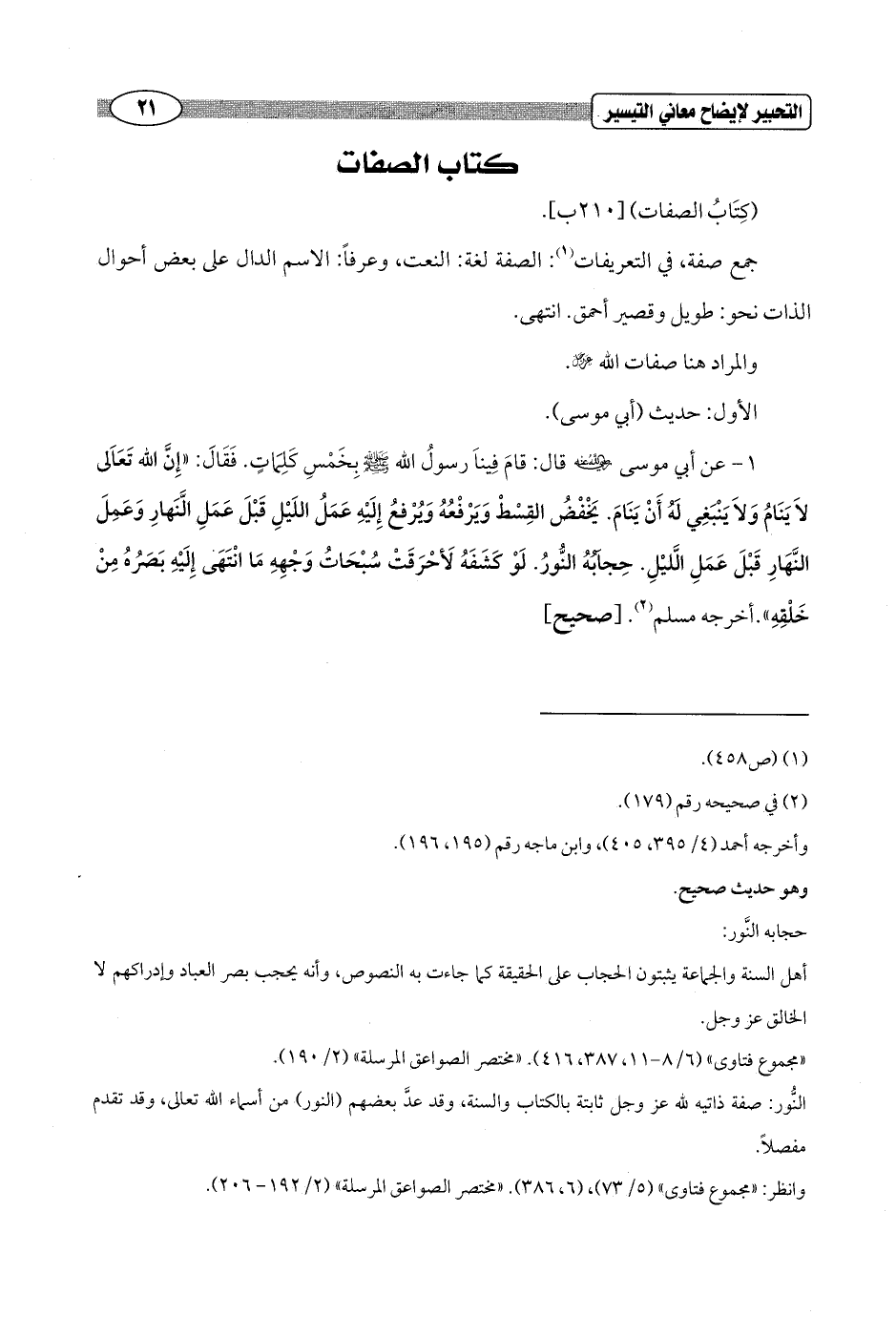 1 - عن أبي موسى - رضي الله عنه - قال: قامَ فِيناَ رسولُ الله - صلى الله عليه وسلم - بِخَمْسِ كَلِمَاتٍ. فَقَالَ: "إِنَّ الله تَعَاَلى لاَ يَنَامُ وَلاَ يَنْبَغِي لَهُ أَنْ يَنَامَ. يَخْفْضُ القِسْطْ وَيَرْفْعُهُ وَيُرْفعُ إِلَيْهِ عَمَلُ اللَيْلِ قَبْلَ عَمَلِ النَّهَارِ وَعَمِلَ النَّهَارِ قَبْلَ عَمَلِ الَّليْلِ. حِجاَبُهُ النُّورُ. لَوْ كَشَفَهُ لَأحْرَقَتْ سُبْحَاتُ وَجْهِهِ مَا انْتَهَى إِلَيْهِ بَصَرُهُ مِنْ خَلْقِهِ". أخرجه مسلم (¬2). [صحيح]