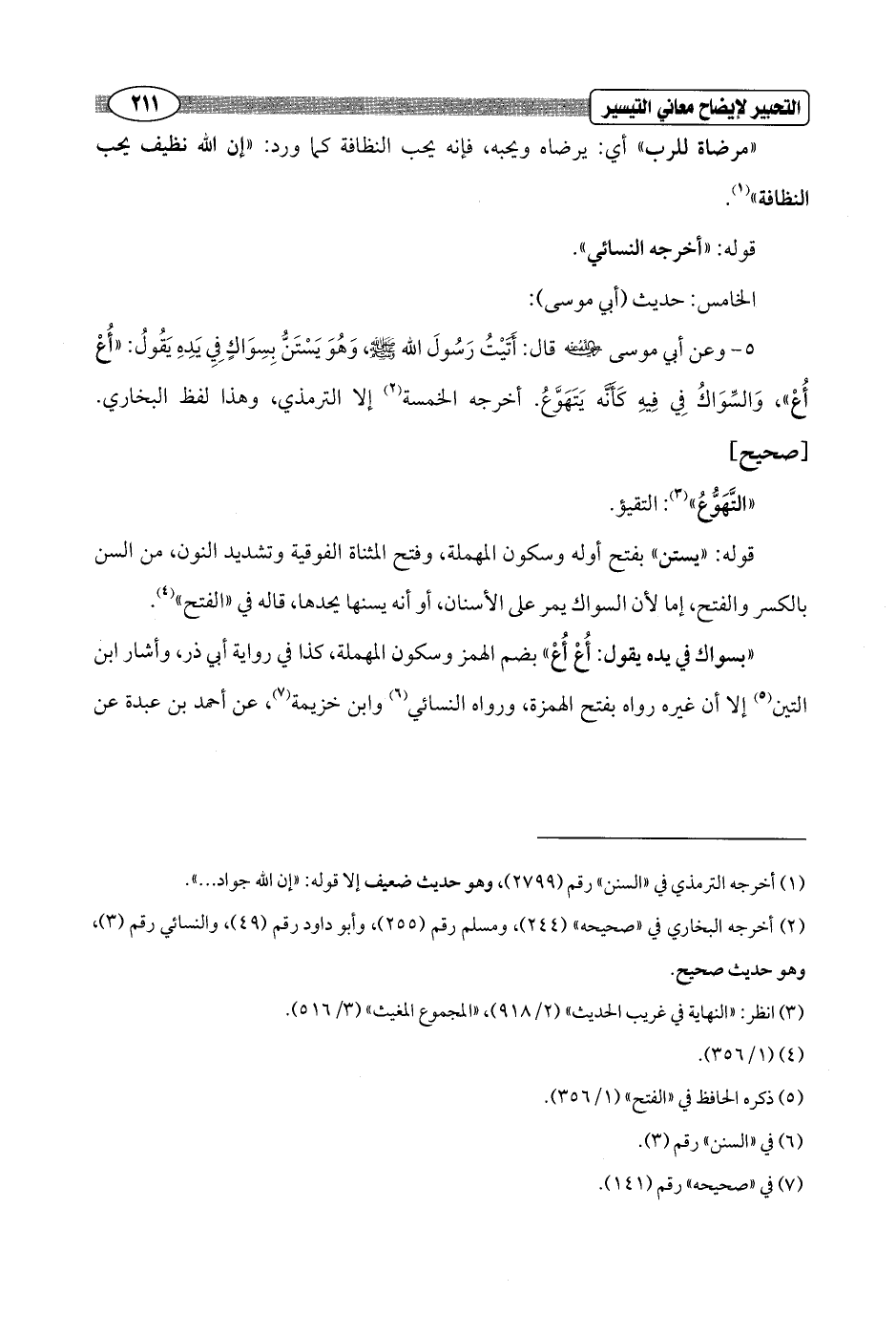 5 - وعن أبي موسى - رضي الله عنه - قال: أَتَيْتُ رَسُولَ الله - صلى الله عليه وسلم -، وَهُوَ يَسْتَنُّ بِسِوَاكٍ فِيِ يَدهِ يَقُولُ: "أُعْ أُعْ"، وَالسِّوَاكُ فِي فِيهِ كَأنَّه يَتَهَوَّعُ. أخرجه الخمسة (¬2) إلا الترمذي، وهذا لفظ البخاري. [صحيح]