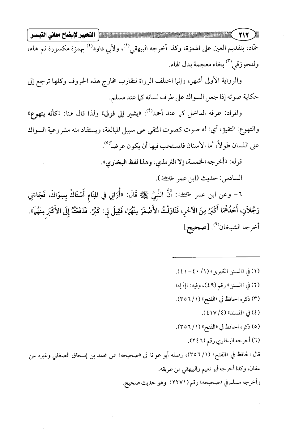 6 - وعن ابن عمر - رضي الله عنهما -: أَنَّ النَّبِيِّ - صلى الله عليه وسلم - قَالَ: "أُرَانِي في المِنَامِ أَسْتَاكُ بِسِوَاكَ, فَجَاءَنِي رَجُلاَنِ، أَحَدُهُمَا أَكْبَرُ مِنَ الآخَرِ، فَنَاوَلْتُ الأَصْغَرَ مِنْهُمَا، فَقِيلَ لِي: كَبِّرْ. فَدَفَعْتُهُ إِلَى الأَكْبَرِ مِنْهُماَ". أخرجه الشيخان (¬6). [صحيح]