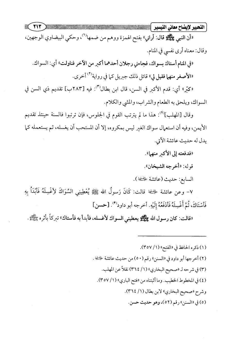 "في المنام أستاك بسواك، فجاءني رجلان أحدهما أكبر من الآخر فناولت" أي: السواك.