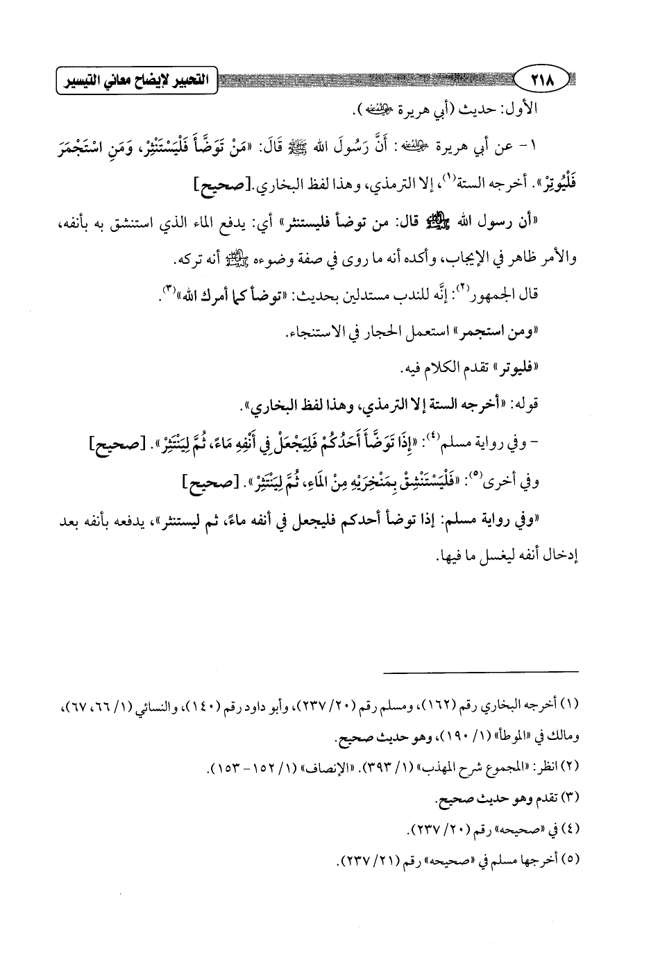 1 - عن أبي هريرة - رضي الله عنه -: أَنَّ رَسُولَ الله - صلى الله عليه وسلم - قَالَ: "مَنْ تَوَضَّأَ فَلْيَسْتَنْثِرْ، وَمَنِ اسْتَجْمَرَ فَلْيُوتِرْ". أخرجه الستة (¬1)، إلا الترمذي، وهذا لفظ البخاري. [صحيح]