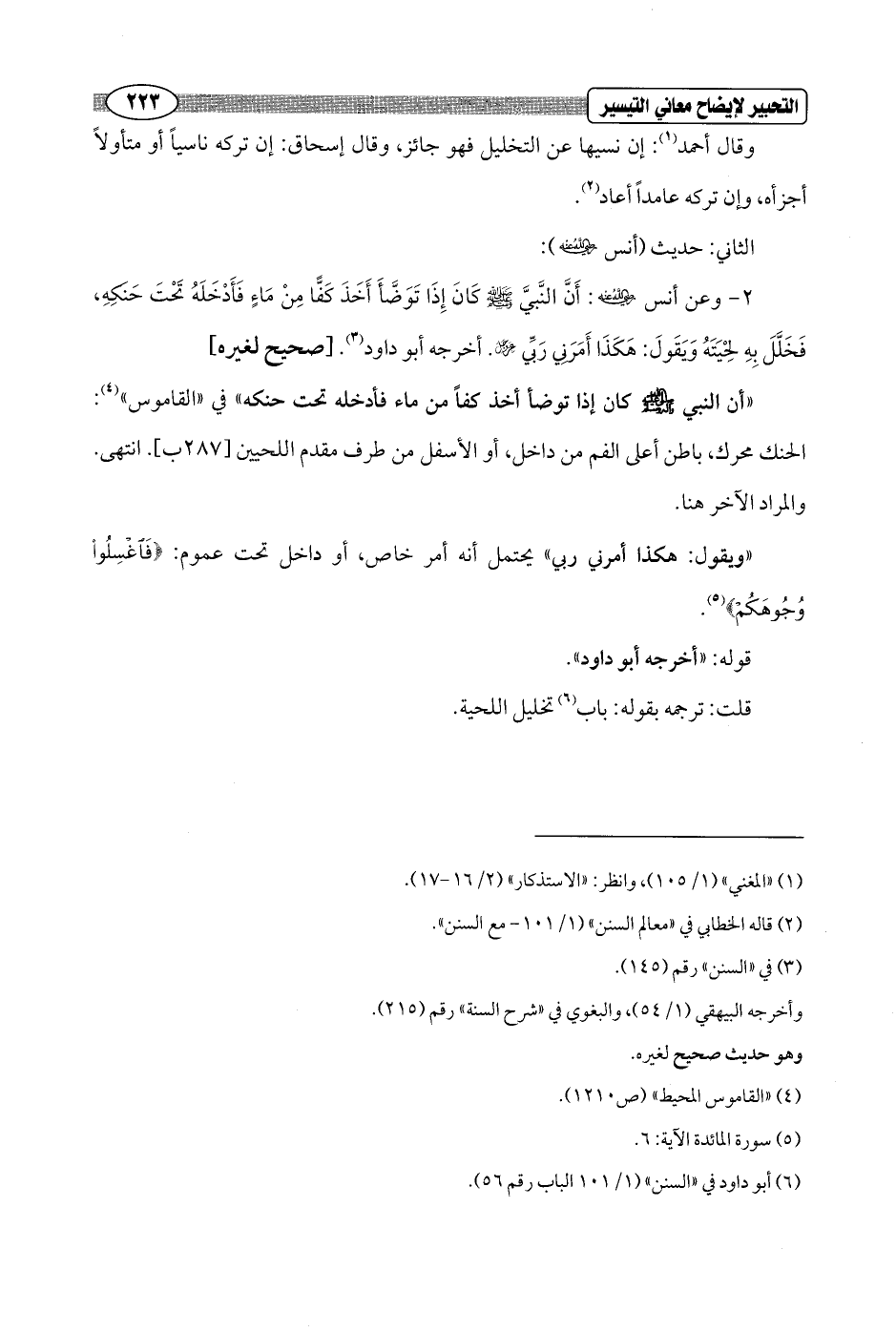 2 - وعن أنس - رضي الله عنه -: أَنَّ النَّبيَّ - صلى الله عليه وسلم - كَانَ إِذَا تَوَضَّأَ أَخَذَ كَفًّا مِنْ مَاءٍ فَأَدْخَلَهُ تَحْتَ حَنَكِهِ، فَخَلَّلَ بِهِ لِحْيَتَهُ وَيَقَولَ: هَكَذَا أَمَرَنِي رَبِّي - عز وجل -. أخرجه أبو داود (¬3). [صحيح لغيره]