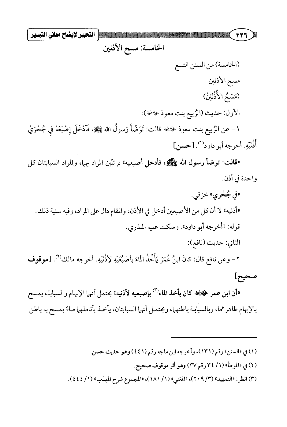 2 - وعن نافع قال: كانَ ابنُ عُمَرَ يَأْخُذُ المَاءَ بأصْبُعَيْهِ لأِذُنَيْهِ. أخرجه مالك (¬2). [موقوف صحيح]