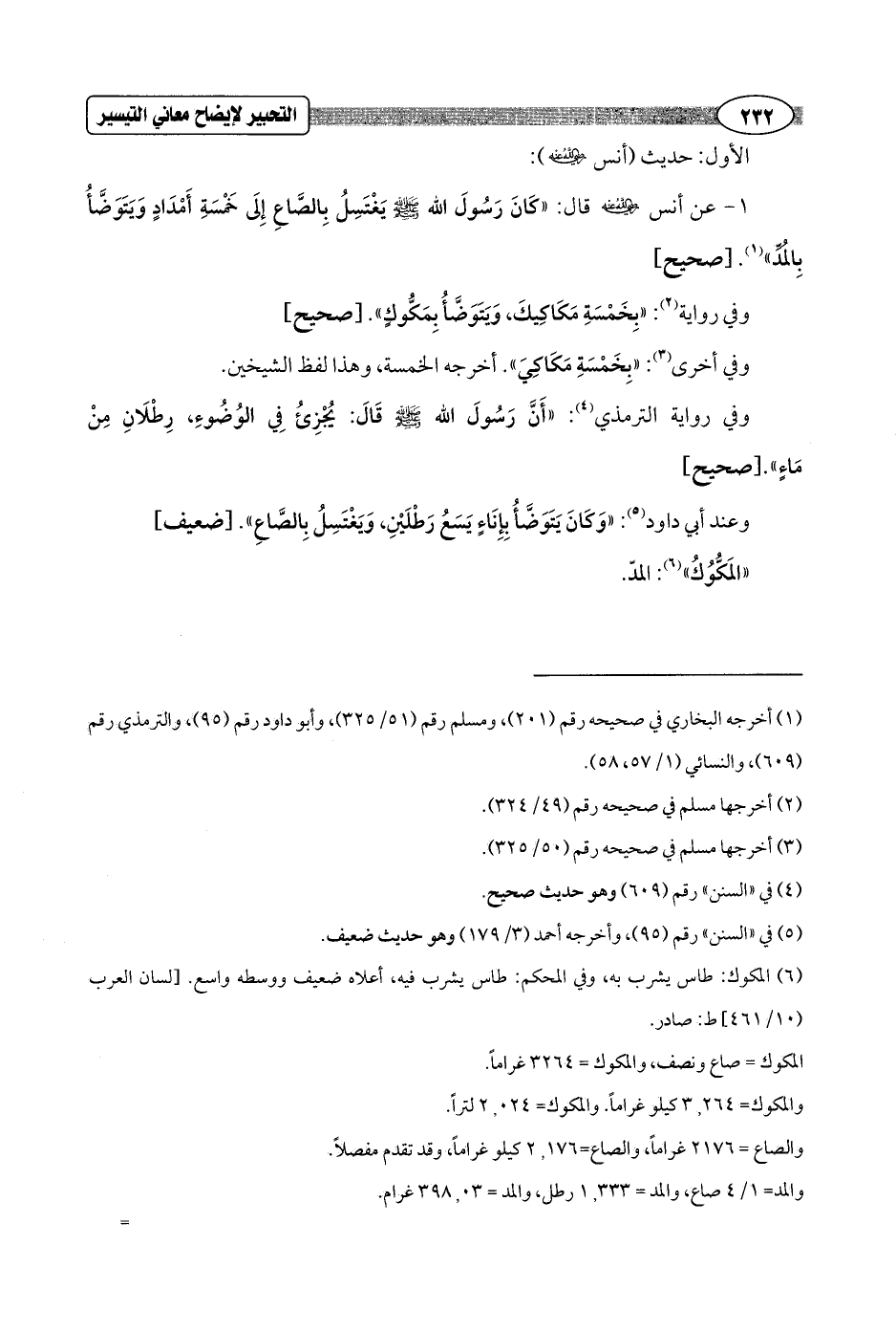 1 - عن أنس - رضي الله عنه - قال: "كان رَسُولَ الله - صلى الله عليه وسلم - يَغْتَسِلُ بِالصَّاعِ إِلَى خَمْسَةِ أَمْدَادٍ وَيَتَوَضَّأُ بِالمُدَّ" (¬1). [صحيح]