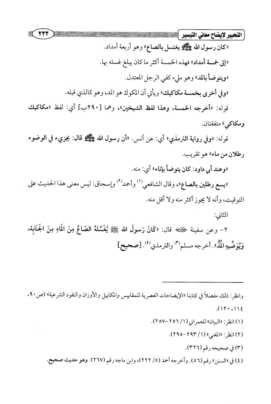 2 - وعن سفينة - رضي الله عنه - قال: "كَانَ رَسولَ الله - صلى الله عليه وسلم - يُغَسِّلهُ الصّاعُ مِنَ المَاءِ مِنَ الجَنَابِة، وَيُوَضِّيهِ المُدُّ". أخرجه مسلم (¬3) والترمذي (¬4). [صحيح]
