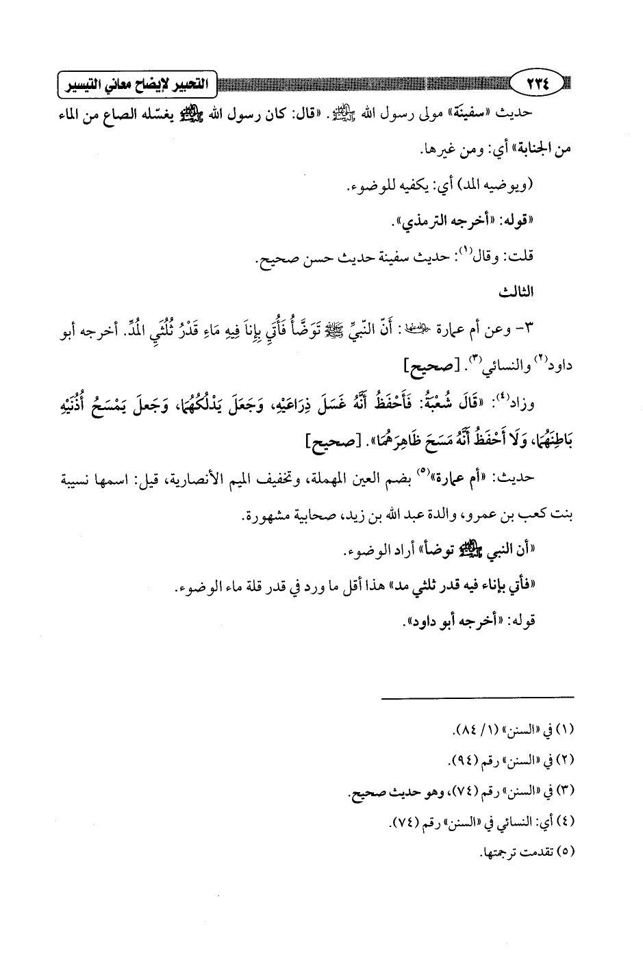 3 - وعن أم عمارة - رضي الله عنها -: أَنّ النّبيِّ - صلى الله عليه وسلم - تَوَضَّأُ فَأُتَيِ بِإِناَ فِيهِ مَاءِ قَدْرُ ثُلُثَيِ المُدِّ. أخرجه أبو داود (¬2) والنسائي (¬3). [صحيح]