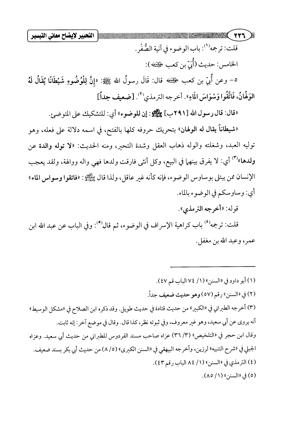 5 - وعن أُبيّ بن كعب - رضي الله عنه - قال: قَالَ رسولُ الله - صلى الله عليه وسلم -: "إِنَّ لِلْوُضُوءِ شَيْطَانًا يُقَالُ لَهُ الوَلْهَانُ، فَاتَّقُوا وَسْوَاسَ المَاءِ". أخرجه الترمذي (¬2). [ضعيف جداً]