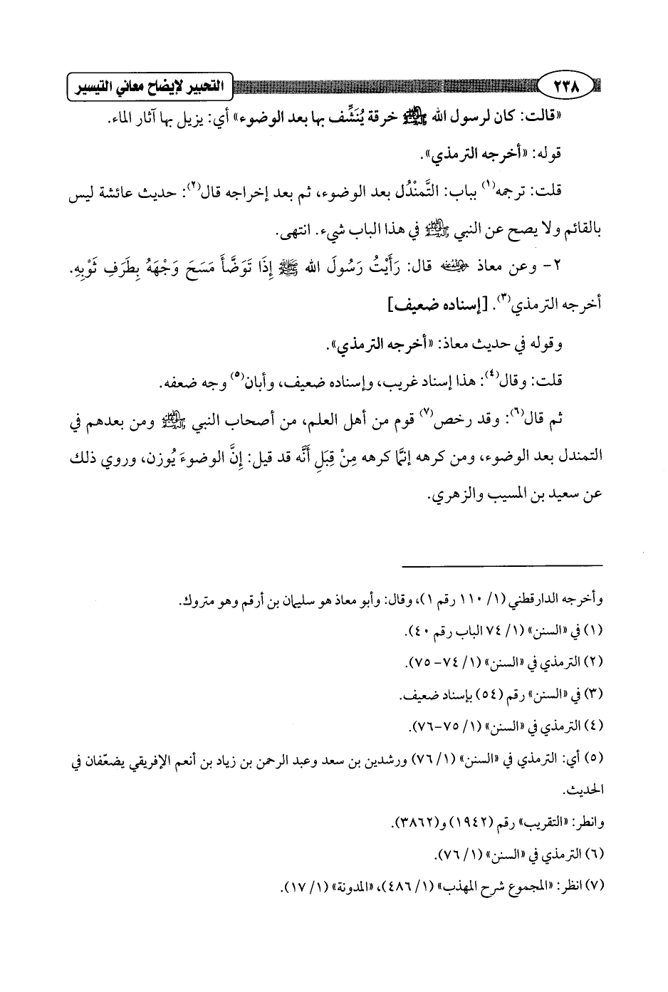2 - وعن معاذ - رضي الله عنه - قال: رَأَيْتُ رَسُولَ الله - صلى الله عليه وسلم - إِذَا تَوَضَّأَ مَسَحَ وَجْهَهُ بِطَرَفِ ثَوْبِهِ. أخرجه الترمذي (¬3). [إسناده ضعيف]