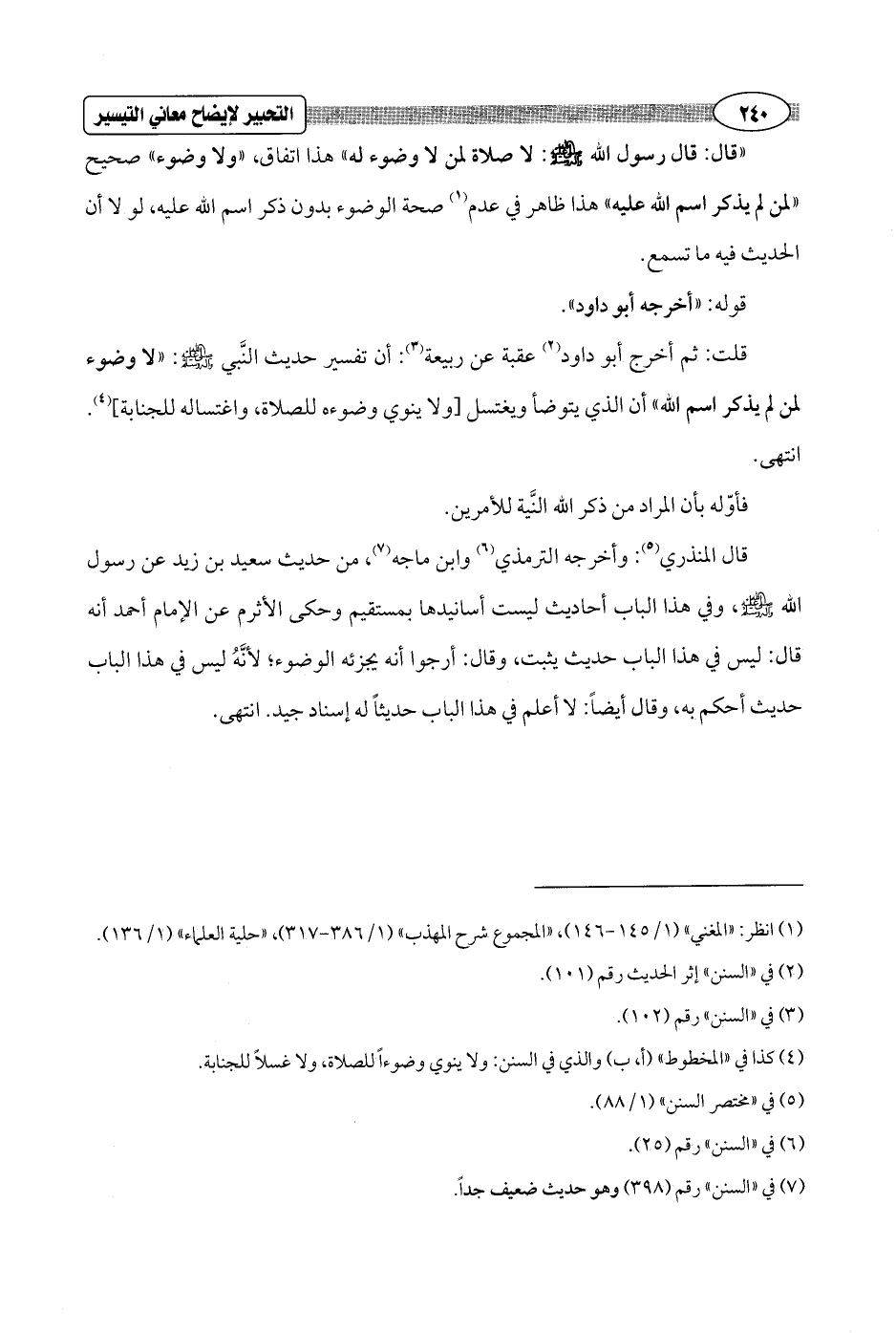 "قال: قال رسول الله - صلى الله عليه وسلم -: لا صلاة لمن لا وضوء له" هذا اتفاق، "ولا وضوء" صحيح "لمن لم يذكر اسم الله عليه" هذا ظاهر في عدم (¬1) صحة الوضوء بدون ذكر اسم الله عليه, لولا أن الحديث فيه ما تسمع.