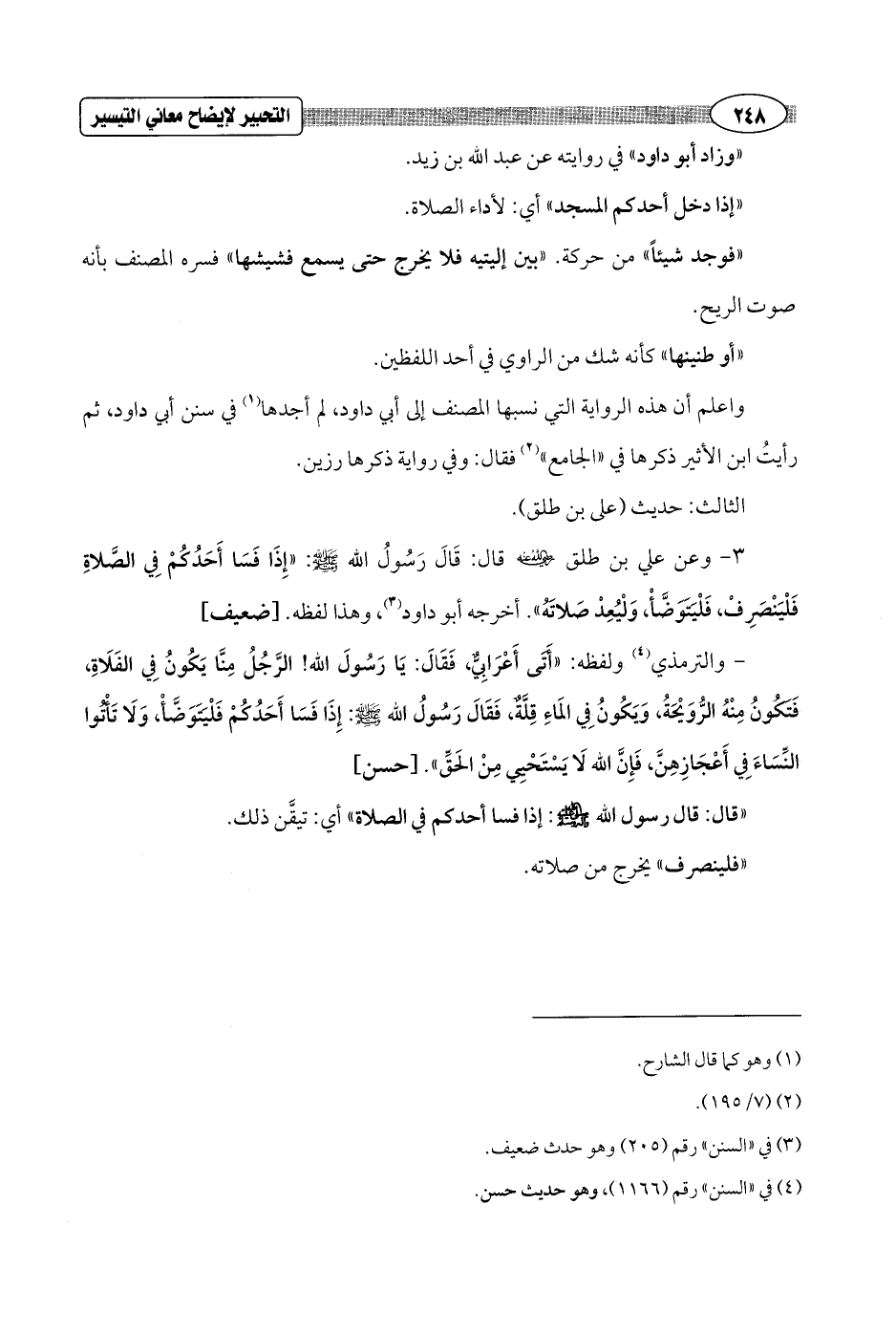 3 - وعن علي بن طلق - رضي الله عنه - قال: قَالَ رَسُولُ الله - صلى الله عليه وسلم -: "إِذَا فَسَا أَحَدُكُمْ فِي الصَّلاةِ فَلْيَنْصَرِفْ، فَلْيَتوَضَّأْ، وَلْيُعِدْ صَلاتَهُ". أخرجه أبو داود (¬3)، وهذا لفظه. [ضعيف]