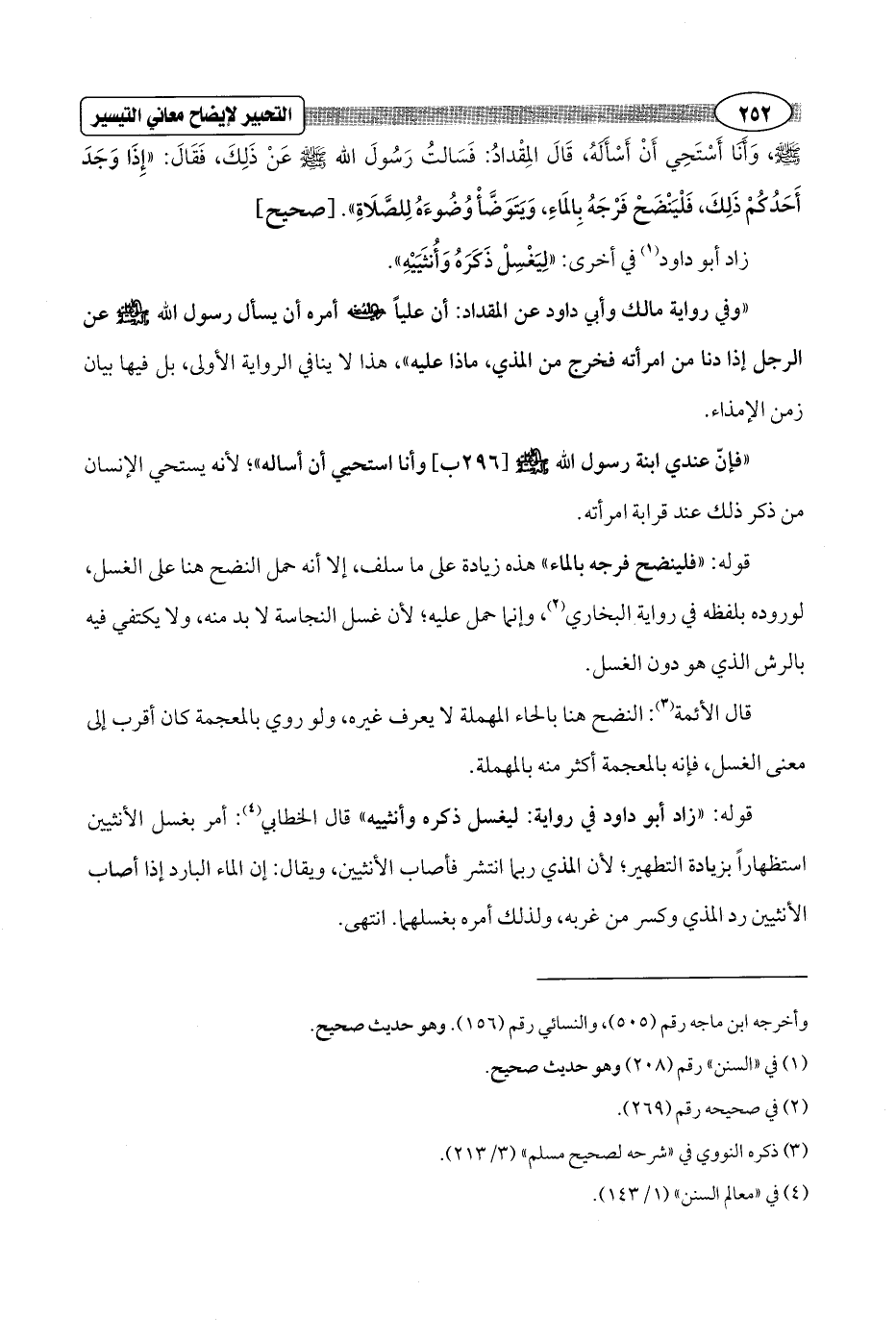 - صلى الله عليه وسلم -، وَأَنَا أَسْتَحِي أَنْ أَسْأَلهُ, قَالَ المِقْدادُ: فَسَالتُ رَسُولَ الله - صلى الله عليه وسلم - عَنْ ذَلِكَ، فَقَالَ: "إِذَا وَجَدَ أَحَدُكُمْ ذَلِكَ، فَلْيَنْضَحْ فَرْجَهُ بِالمَاءِ، وَيَتَوَضَّأْ وُضُوءَهُ لِلصَّلَاةِ". [صحيح]