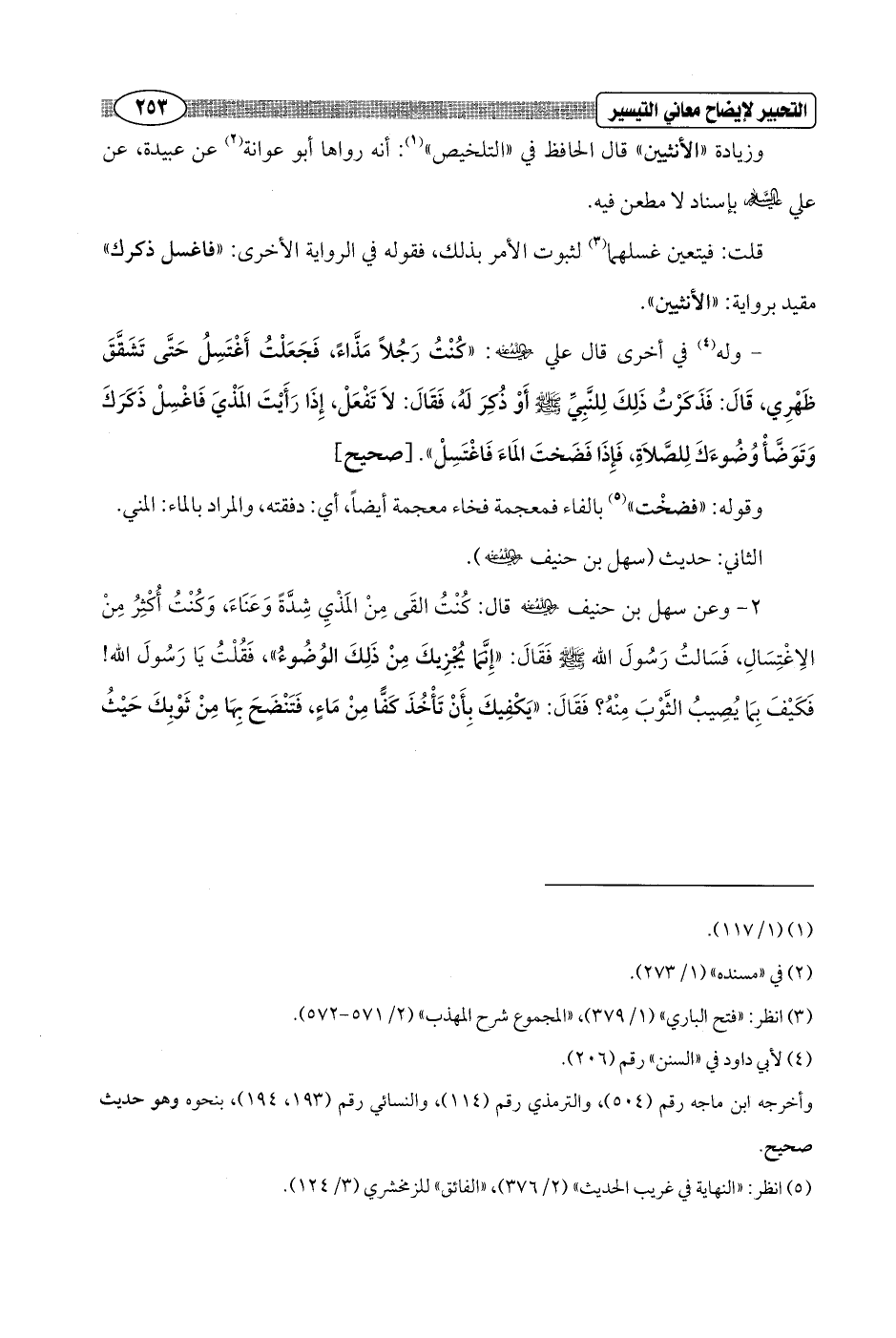 2 - وعن سهل بن حنيف - رضي الله عنه - قال: كُنْتُ القَى مِنْ المَذْيِ شِدَّةً وَعَنَاءَ، وَكُنْتُ أُكْثِرُ مِنْ الِاغْتِسَالِ، فَسَالتُ رَسُولَ الله - صلى الله عليه وسلم - فَقَالَ: "إِنَّمَا يُجْزِيكَ مِنْ ذَلِكَ الوُضُوءُ"، فَقُلْتُ يَا رَسُولَ الله! فَكَيْفَ بِمَا يُصِيبُ الثَّوْبَ مِنْهُ؟ فَقَالَ: "يَكْفِيكَ بِأَنْ تَأْخُذَ كَفًّا مِنْ مَاءٍ, فَتَنْضَحَ بِهَا مِنْ ثَوْبِكَ حَيْثُ