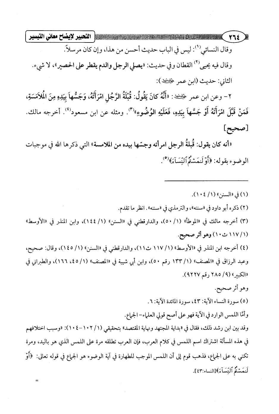 "أنه كان يقول: قُبلةُ الرجل امرأته وجسّها بيده من الملامسة" التي ذكرها الله في موجبات الوضوء بقوله: {أَوْ لَامَسْتُمُ النِّسَاءَ} (¬5).