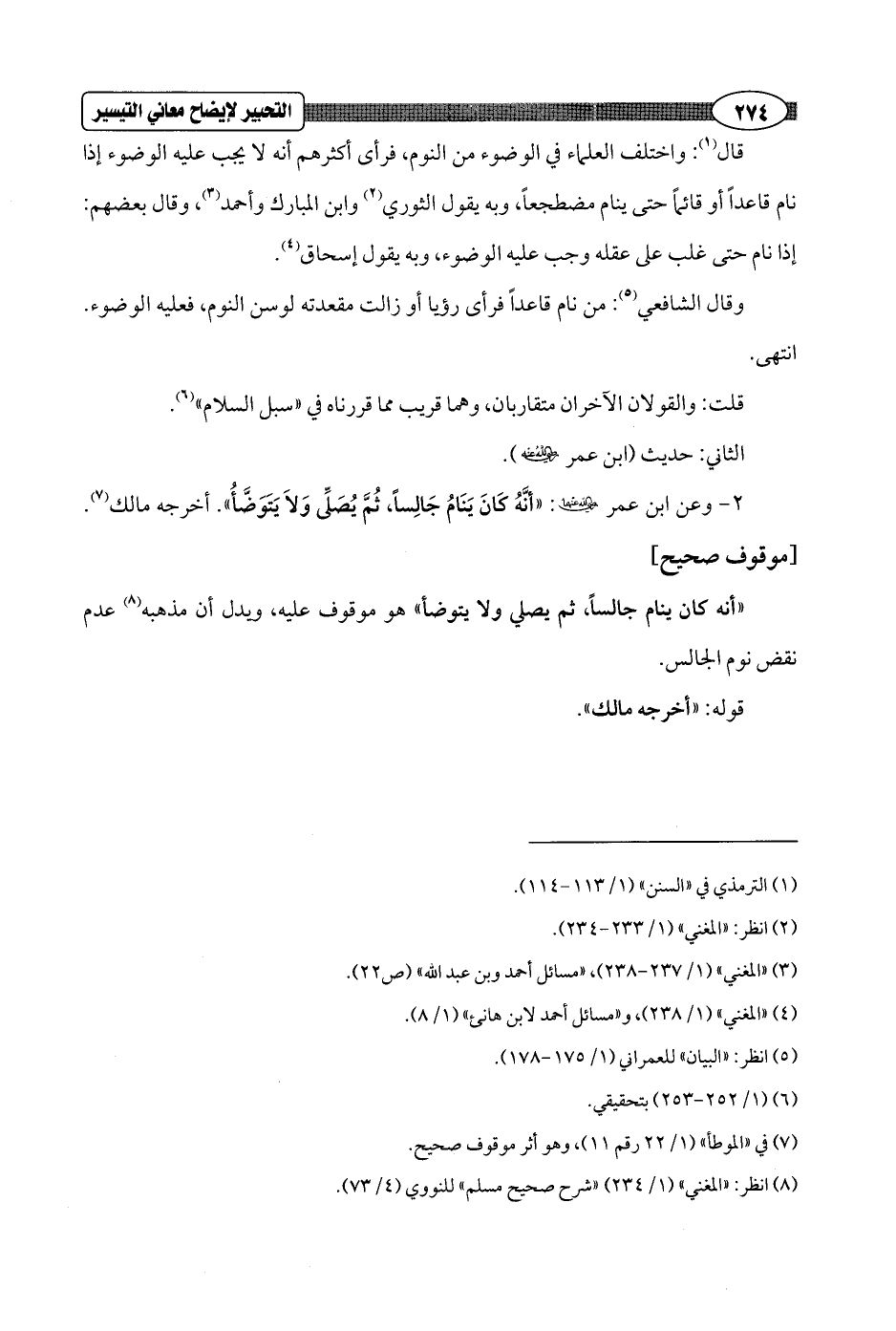 2 - وعن ابن عمر - رضي الله عنهما -: "أَنَّهُ كَانَ يَنَامُ جَالِساً، ثُمَّ يُصَلِّى وَلاَ يَتَوَضَّأُ". أخرجه مالك (¬7). [موقوف صحيح]