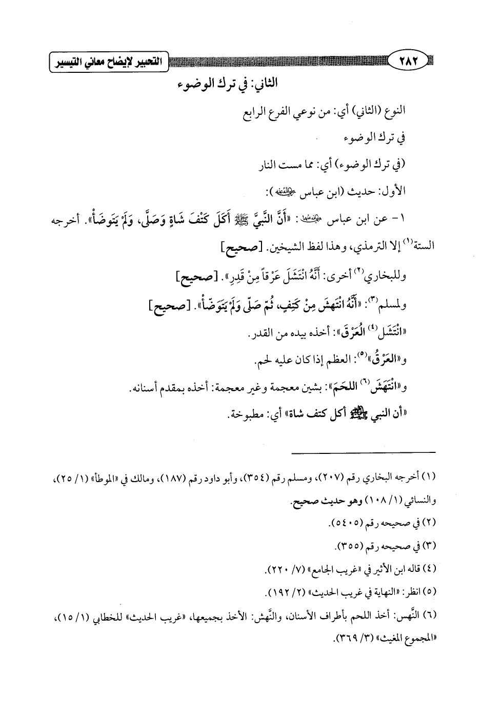1 - عن ابن عباس - رضي الله عنهما -: "أَنَّ النَّبيَّ - صلى الله عليه وسلم - أَكلَ كَتْفَ شَاةٍ وَصَلَّى، وَلَمْ يَتَوضَأْ". أخرجه الستة (¬1) إلا الترمذي، وهذا لفظ الشيخين. [صحيح]