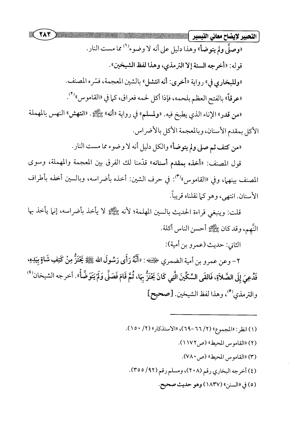 2 - وعن عمرو بن أمية الضمري - رضي الله عنه -: "أَنَّهُ رَأَى رَسُولَ الله - صلى الله عليه وسلم يَحْتَزُّ مِنْ كَتِفِ شاةٍ بِيَدهِ، فَدُعِيَ إِلَى الصَّلاَةِ، فَالقَى السِّكِّينَ الَّتي كَانَ يَحْتَزُّ بِهَا، ثُمَّ قَامَ فَصَلَّى وَلَمْ يَتَوَضَّأْ". أخرجه الشيخان (¬4) والترمذي (¬5)، وهذا لفظ الشيخين. [صحيح]