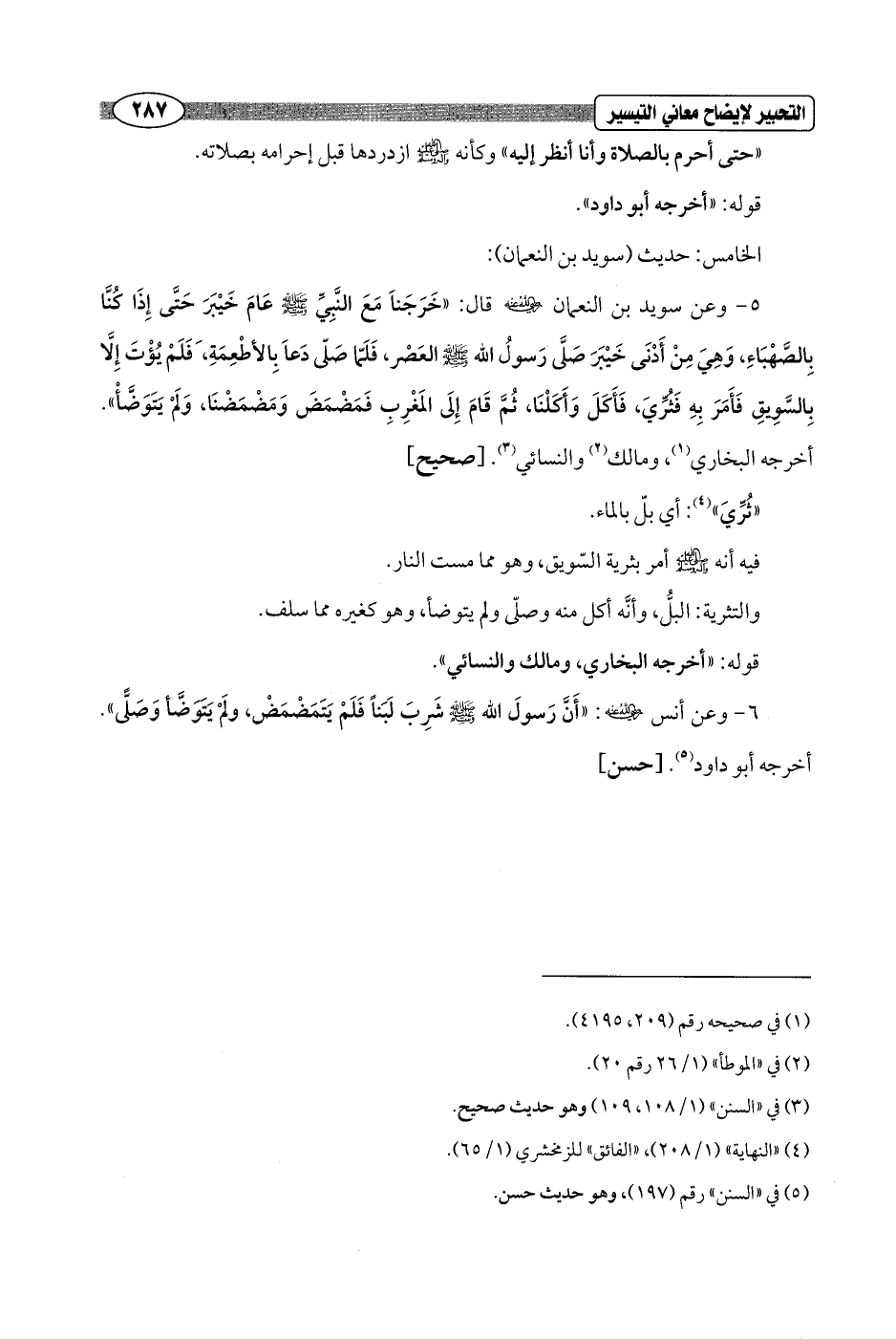 5 - وعن سويد بن النعمان - رضي الله عنه - قال: "خَرَجَناَ مَعَ النَّبِيِّ - صلى الله عليه وسلم - عَامَ خَيْبَرَ حَتَّى إِذَا كُنَّا بِالصَّهْبَاءِ، وَهِيَ مِنْ أَدْنَى خَيْبَرَ صَلَّى رَسولُ الله - صلى الله عليه وسلم - العَصْر، فَلَمَّا صَلّى دَعاَ بِالأطْعِمَةِ, فَلَمْ يُؤْتَ إِلَّا بِالسَّوِيقِ فَأَمَرَ بِهِ فَثُرِّيَ، فَأَكلَ وَأَكَلْنَا، ثُمَّ قَامَ إِلَى المَغْرِبِ فَمَضْمَضَ وَمَضْمَضْنَا، وَلَمْ يَتَوَضَّأْ". أخرجه البخاري (¬1)، ومالك (¬2) والنسائي (¬3). [صحيح]